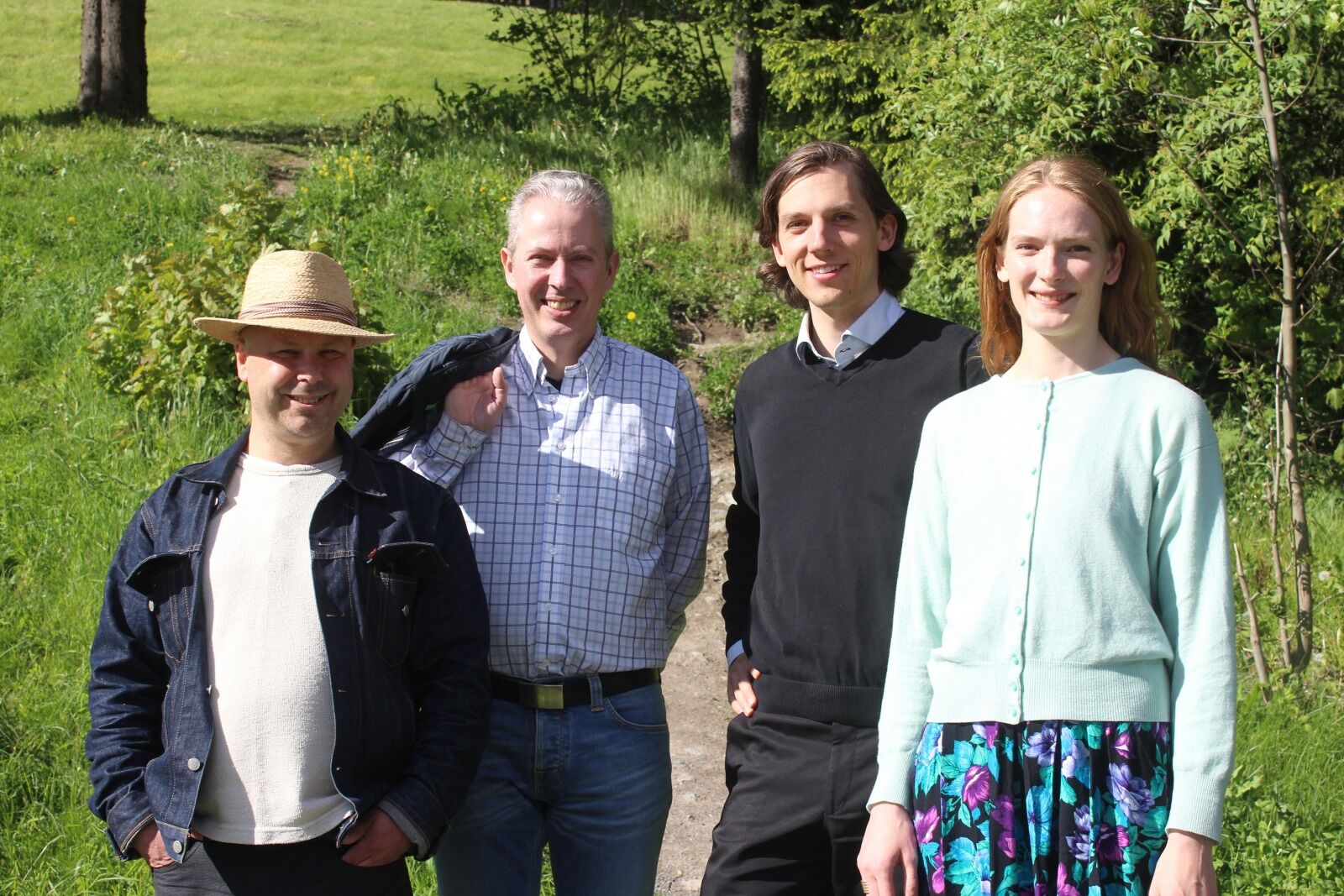 INVITERER TIL GRØNN FEST: Miljøpartiet De Grønne i Groruddalen samles til sommerfest førstkommende helg. Her står lokallagslederne Jon Julius Sandal (f.v.) i Grorud MDG, Finn Dyrkorn i Stovner MDG, Kristoffer Robin Haug i Bjerke MDG og Eline Solum Gran i Alna MDG. Foto:Bilde 1 av 1