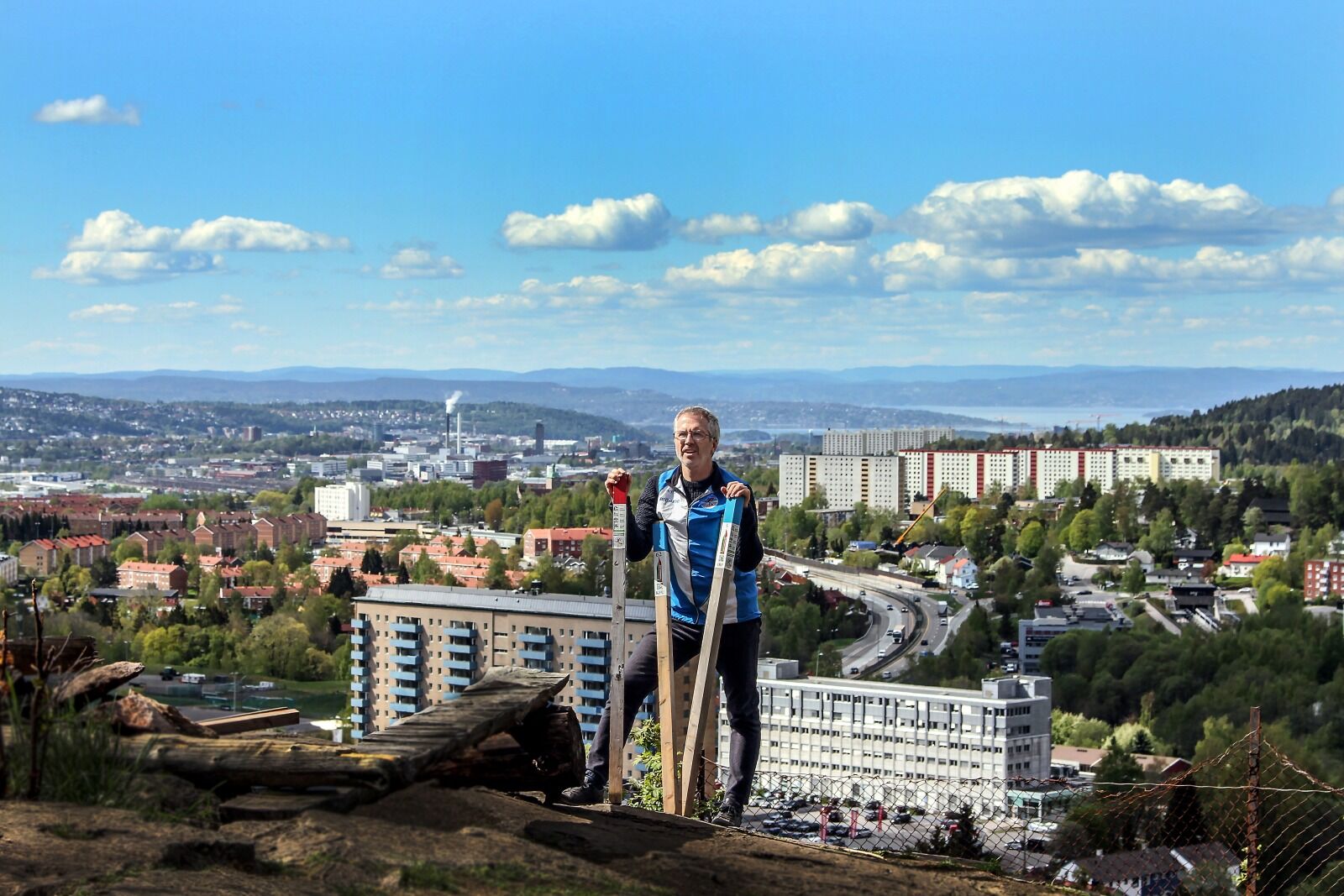 NÅ HAR JAKTEN BEGYNT I DALEN: Vidar Benjaminsen, leder i Lillomarka Orienteringslag, ved utsiktspunktet ved tidligere Ravnkollen hoppbakke på Romsås. Dette er ikke jobb, men et livskall, understreker stolpe-sjefen. Foto: Kjetil KlevenBilde 1 av 3