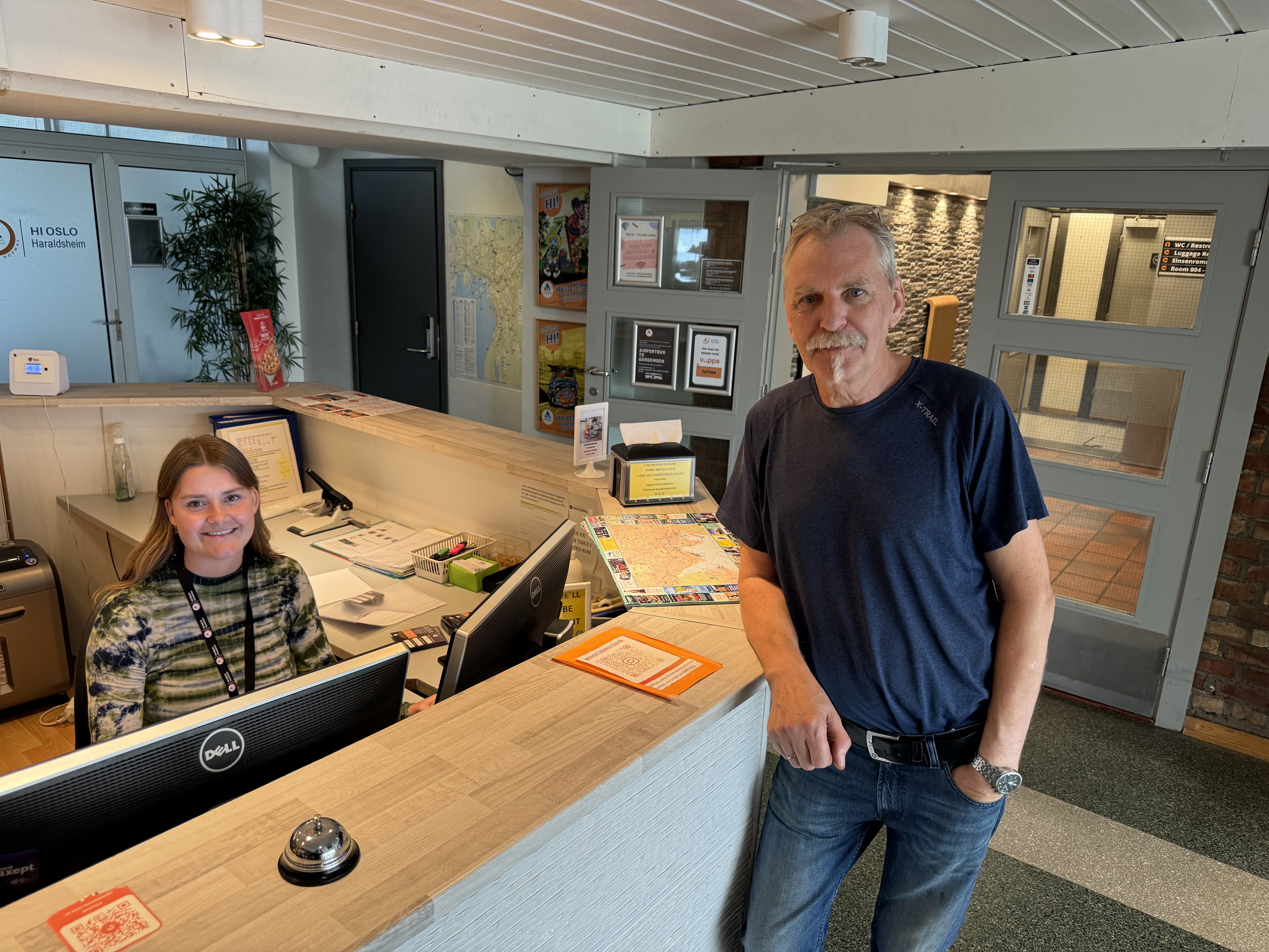 HEKTISK HOSTELL: Det har vært en travel sommer på Haraldsheim, men det er sånn resepsjonist Louise Hermanrud Hagen og teknisk ansvarlig Harald Mo vil ha det.