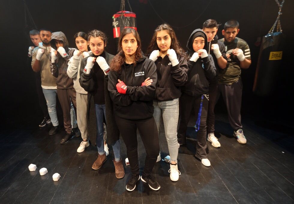 KAMPKLARE SKUESPILLERE: Magnus Nygård (f.v.), Kumaran Nathan, Nabeel Syed, Hayaa Hussain, Celina Halim, Hina Zaidi, Iqra Mushtaq, Lojan Al-jabri, Deniz Mert Tikir og Farqaleet Iqbal har tatt steget fra Stovner Bokseklubb til Rommen Scene og teaterstykket «Best». Foto:Bilde 1 av 1