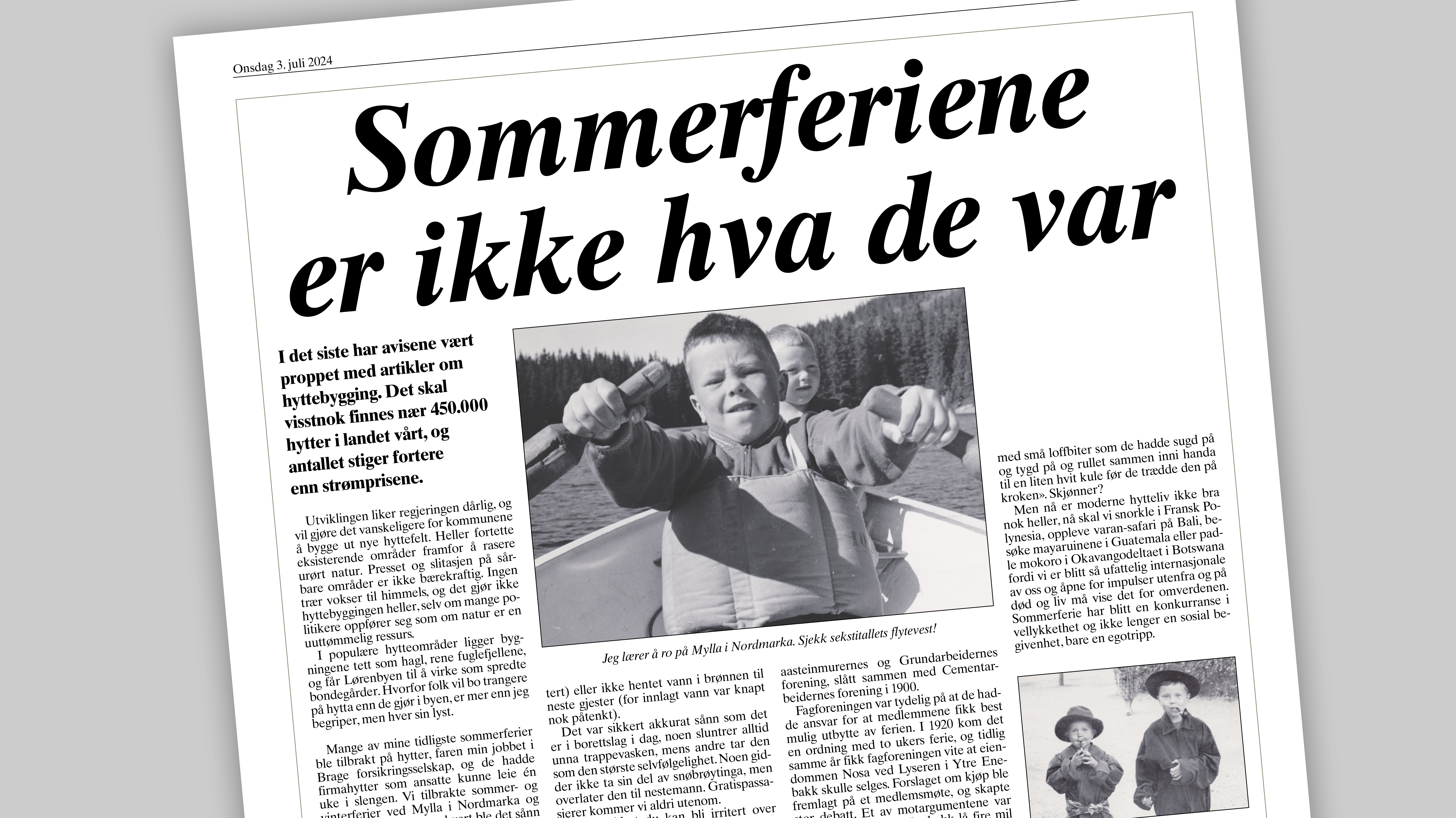 I dag leste jeg «Sommerferiene er ikke hva de var» og fant meg selv nikkende hele veien. Jeg kjenner igjen beskrivelsene fra «gamle dager» – selv om jeg vel er en god del eldre enn deg (86). Sjarmen med sommerferien for oss oslobarn var jo nettopp å oppleve fri natur, og leke med det vi fant på der ute.
