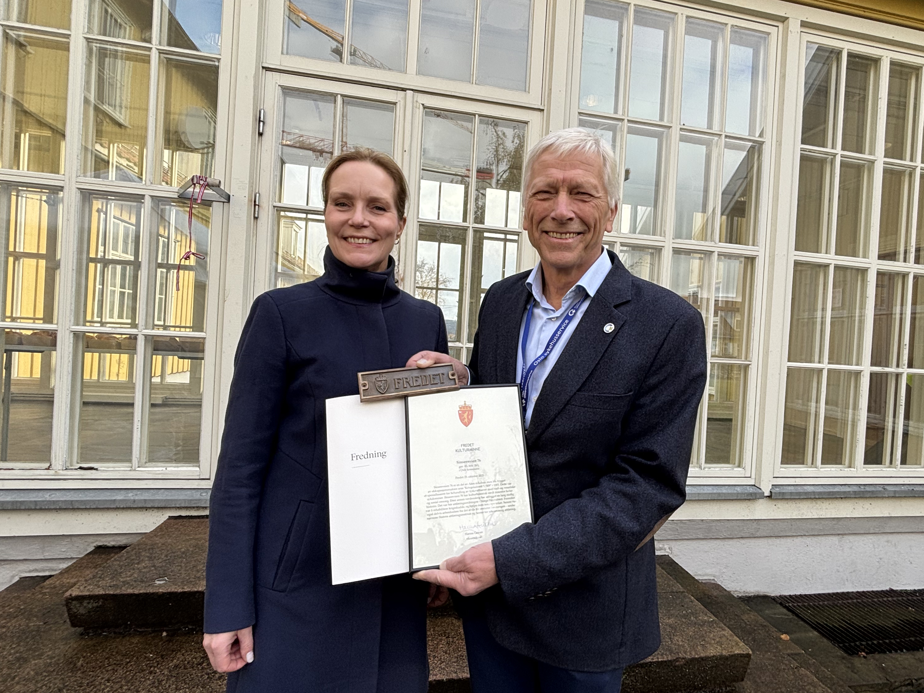 VIKTIG FOR HISTORIEN: Riksantikvar Hanna Geiran (t.v.) og direktør for Oslo sykehusservice, Geir Teigstad, er godt fornøyd med at historien fra krigen bevares i nye Aker. (Foto: Jan Magnus Weiberg-Aurdal, Riksantikvaren).Bilde 1 av 2
