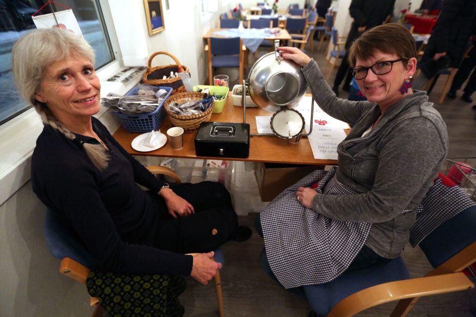 TRADISJONSRIK TOMBOLA: Ikke et julemarked hos Høybråten Sanitetsforening uten tombola og den legendariske vasketrommelen som brukes til dette formålet. Ellinor J. Bekeng (t.v.) og leder Helene Ottersen, har her sin «tombolavakt». Foto:Bilde 1 av 6