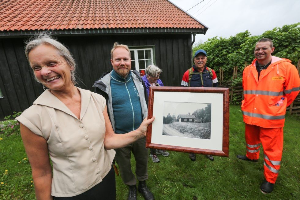 HJERTELIG BESØK: Anna Helene Fellman syntes det var svært hyggelig at følget stoppet ved den gamle husmannsplassen Smedbakken hvor hun bor. Hun ba alle inn i hagen, fant et gammelt bilde av huset og kom med masse spennende informasjon. Foto:Bilde 1 av 4