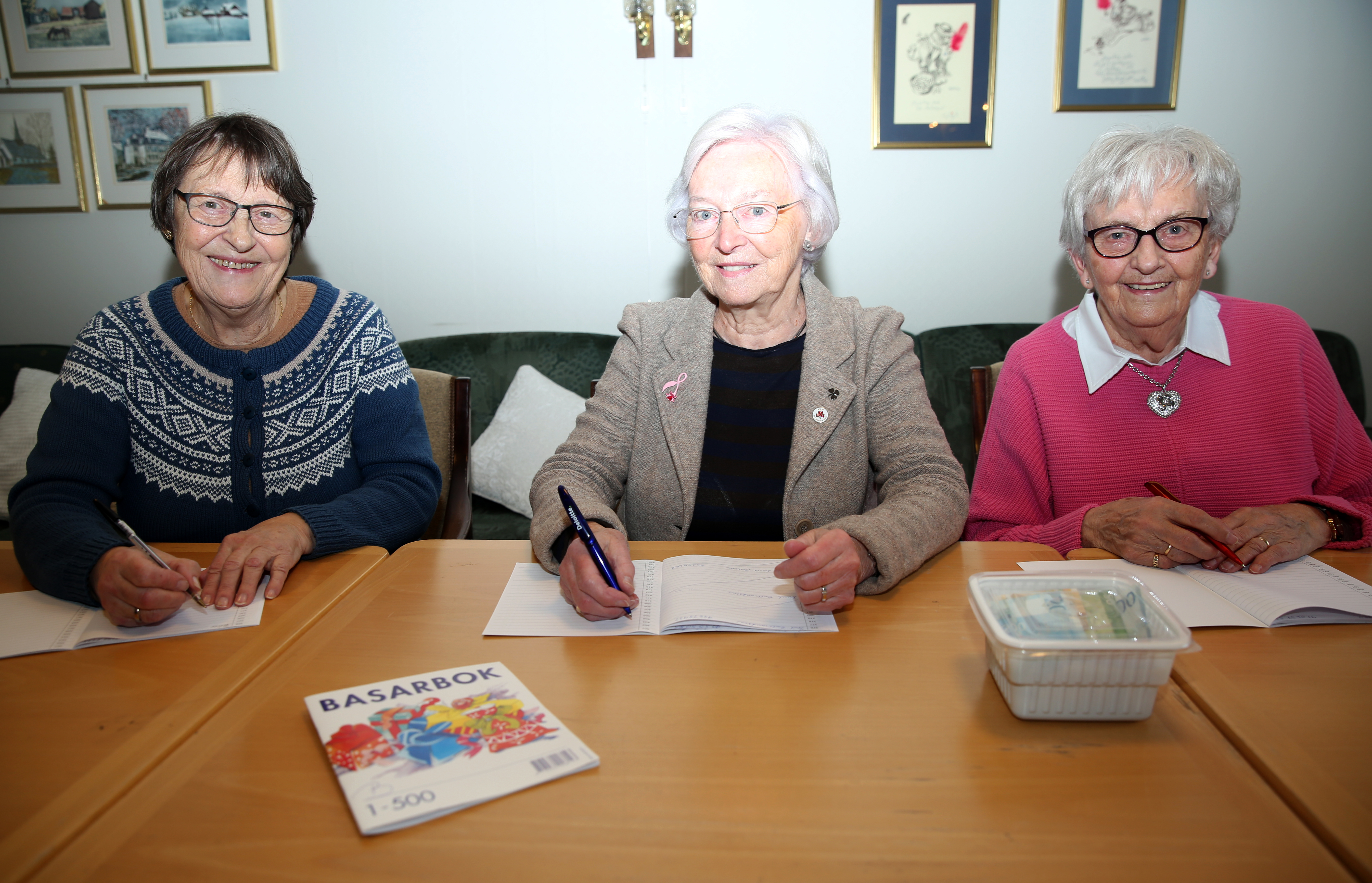 PÅ GAMLEMÅTEN: I tillegg til at loddkjøpernes navn skal skrives inn i loddboka på den gode gamle måten - skal også skikkelig skjønnskrift benyttes - og den kunsten har Inger Sarre Jensen (f v), Gerd Moengen og Aslaug Solan skikkelig dreis på. FOTO: Rolf E. WulffBilde 1 av 8