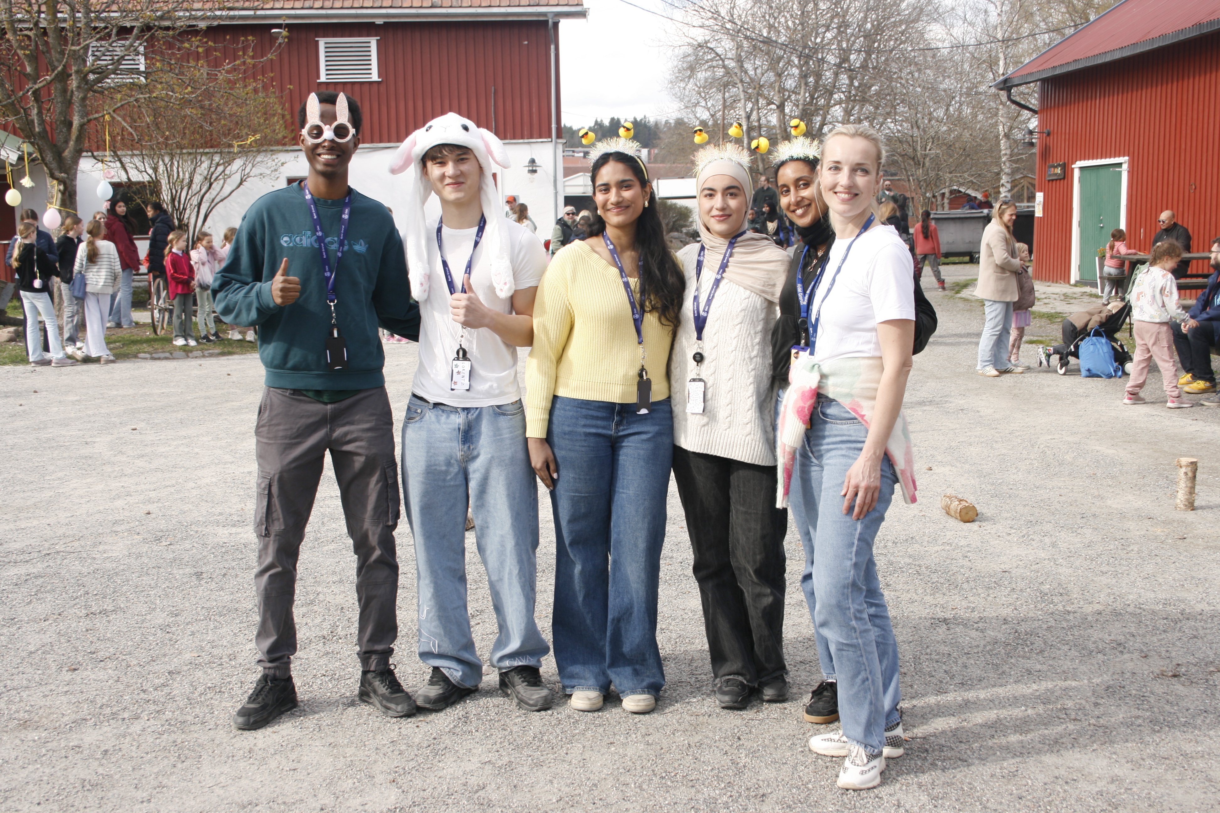STOLT GJENG: Sami Mohamed Hadi (f.v.), Hans Lorentz Lossius, Chuvathika Sathiaseelan, Yasmin Ubara, Meti Olika og Oxana Gundersen kan si seg godt fornøyd med første påskearrangement på Nordtvet gård. Det blir forhåpentligvis ikke det siste.