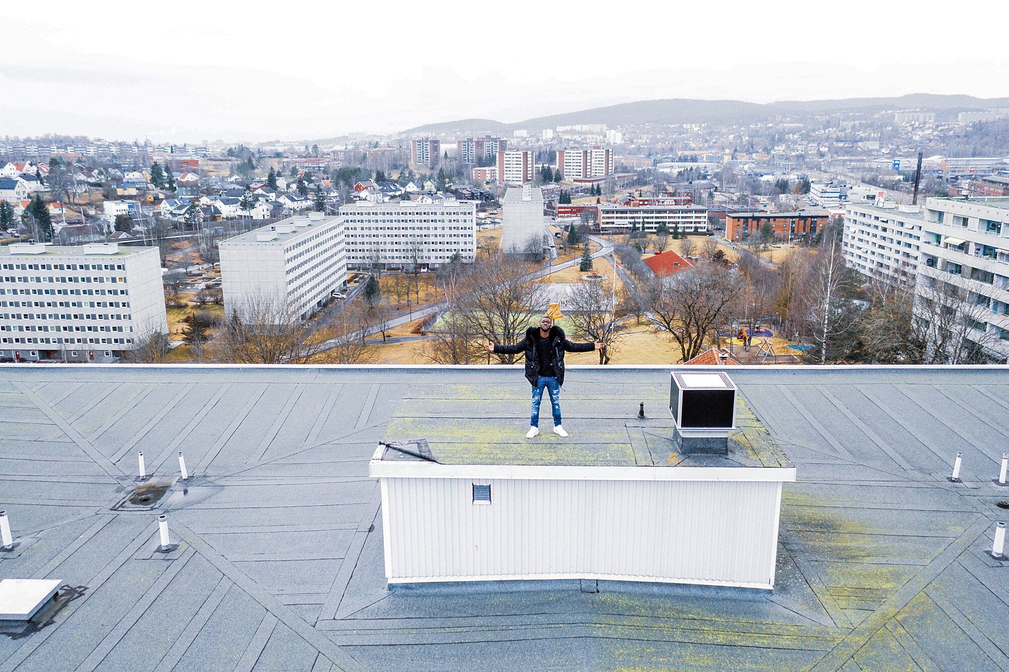 ÅRETS SISTE OG DYPESTE: Yaw «Britz» Britwum er ute med låta «Som før» der han forteller om hvordan farens bortgang påvirket ham og forholdet hans til venner og de som står ham nær. Her fra toppen av Haugenstua (FOTO: Alieer). Foto:Bilde 1 av 2