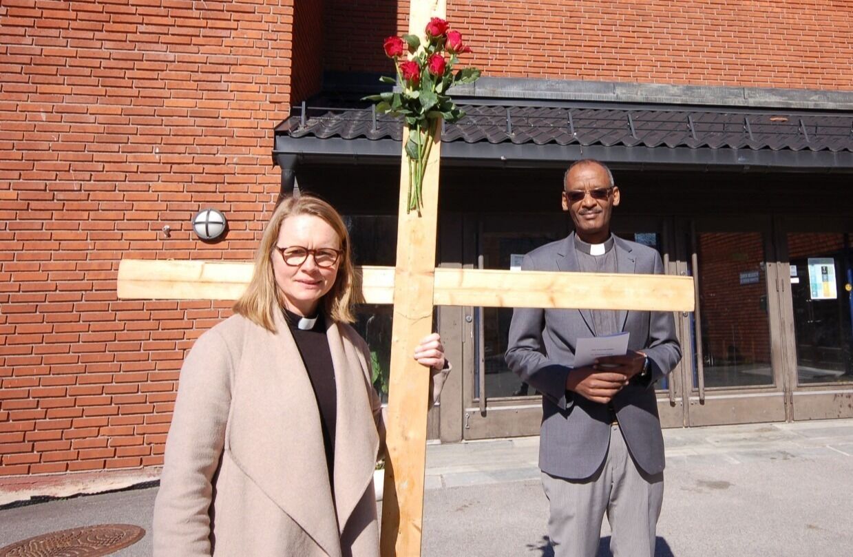 MED KORSET: Sokneprest Elin Lunde og vikarprest Yohannes Shanka foran inngangspartiet til Fossum kirke. Foto:Bilde 1 av 2