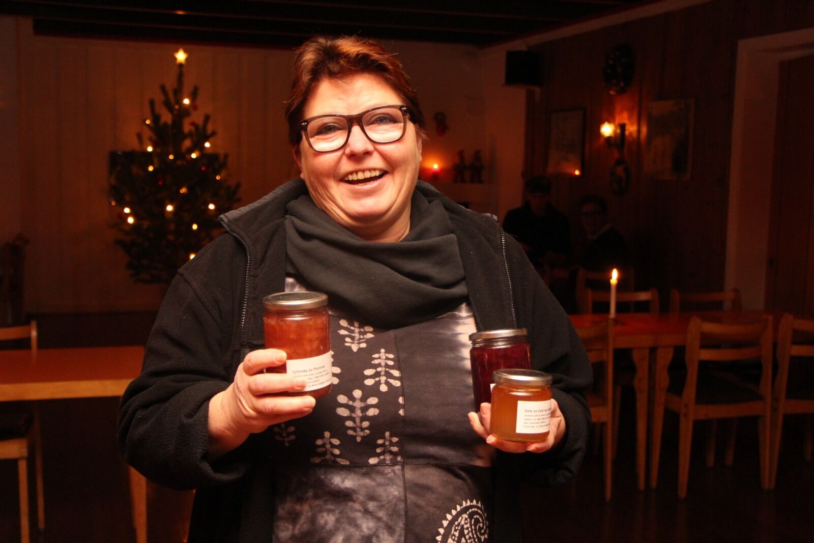 NYTTÅRSGLIS: Dorthe Nygaard viser stolt fram sitt eget syltetøy som hun selger på Linderudkollen sportsstue som hun og mannen Oddbjørn driver.