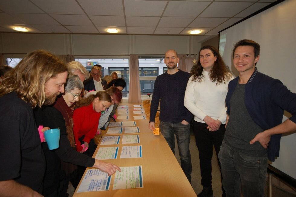MANGE FORSLAG: Deltakerne i workshopen vurderer de forskjellige forslagene for å si sin mening. På høyre side av bordet står prosjektleder Tomasz Frelek og bak ham to av de tre studentene fra Oslo Met som skal jobbe med forslagene. Bak Frelek står Tom Sløgedal og deretter Rob Starling. Den tredje av studentene, Nadiya Karibayeva, var ikke til stede da bildet ble tatt. Foto:Bilde 1 av 4
