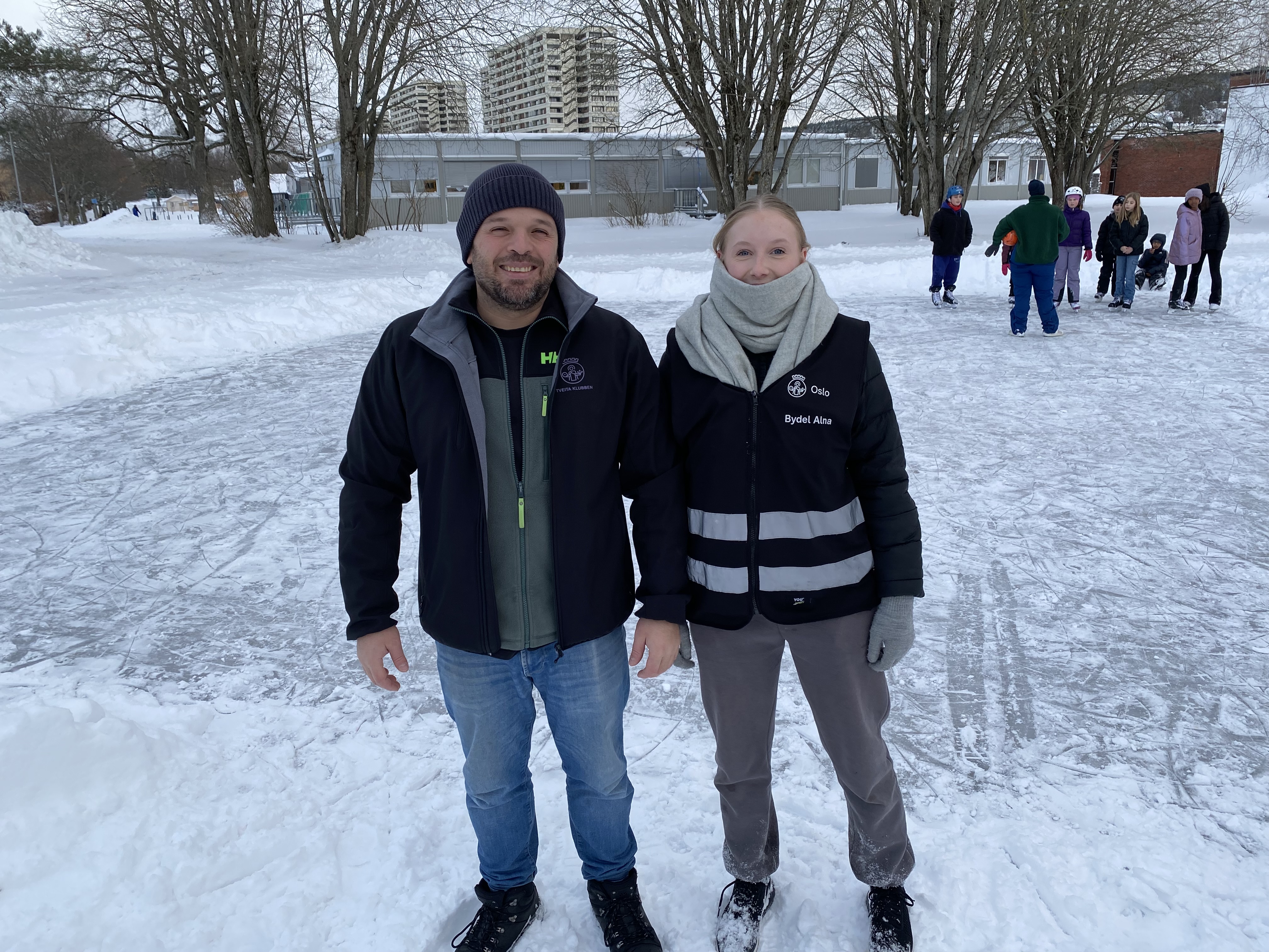 POPULÆRT INNSLAG: Skøytebane utenfor Tveitaklubben er blitt et fast og populært innslag om vinteren. Det er Aljirami Mamuti som har tatt ansvar og laget den. Her med kollega Kamile Leonaviciute.Bilde 1 av 3