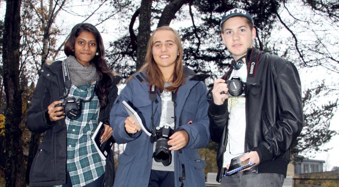 Cecilie Dokka (16), Tomas Foshaugen (15) og Thaksha Mahendran (15) fikk prøve seg som journalister for en dag på Operasjon Dagsverk i går.