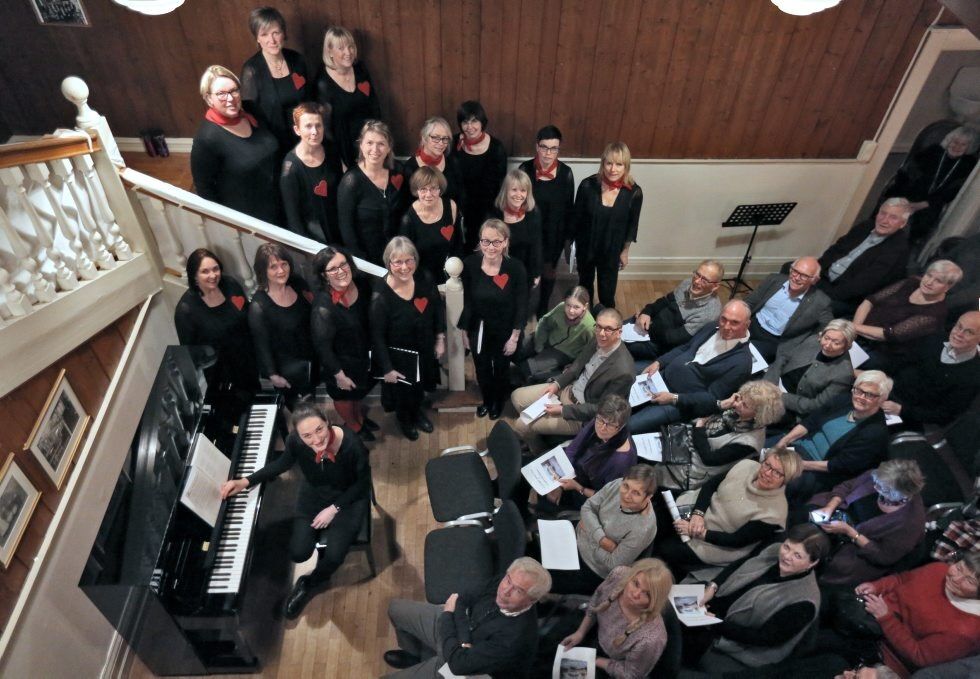 Konserten fant sted i den koselige villaens peisestue, hvor hovedtrappa opp til andre etasje også befinner seg. Og trappa ble en aldeles utmerket scene som skapte en spesiell nærhet til publikum . Men det var nok greit at ikke alle korets 40 sangere var med, da ville det nok blitt ganske trangt i trappetrinnene. Men pianoet som dirigent Julia Selina Blank benyttet, stod trygt nede på gulvet!
