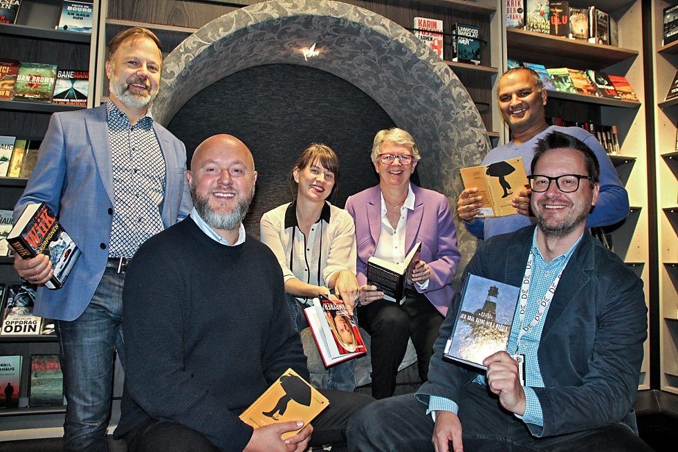 FESTIVALGJENGERE: Denne blide gjengen med lesehester gleder seg stort over at Groruddalen Litteraturfestival nå er i gang. F.v.: Marius Trana, Bjørn Ove Mørch Larsen, Rina Mariann Hansen, Grethe Fossli, Rashid Nawaz og Knut Skansen. Foto:Bilde 1 av 4