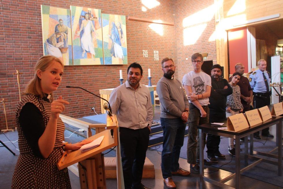 RELIGIONENES STANDPUNKT: Prest Annette Dreyer ledet den interreligiøse paneldebatten om tro og klima. Oslo Pilegrimssenter (den norske kirke), Buddhistforbundet, Ahmadiyya Muslimske Menighet, Islamic Cultural Centre, Norges Hindu Kultur Senter, initiativet Miljøsikh og politiets mangfoldskontakt Roy Cato Einarsen stilte alle opp. Foto:Bilde 1 av 7