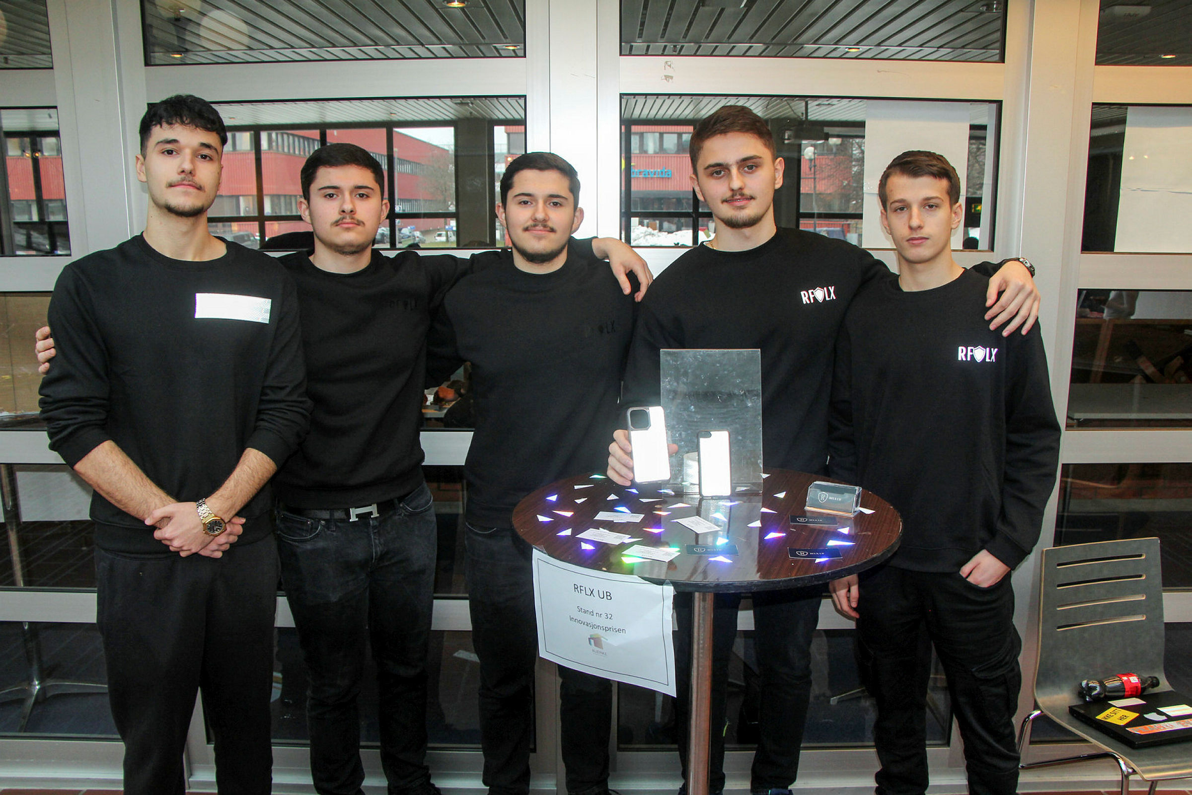 RFLX UB: Guttene på Bjerke Vgs har laget mobildeksler med reflekser på. De håper at det skal føre til at flere unge bruker refleks og er synlige når de går ute. Her med Arshia Amini (f.v), Admir Selami, Almir Selami, Ylljon Ibraimi, Enis Idrizi. Foto: Sindre Veum ApnesethBilde 1 av 1