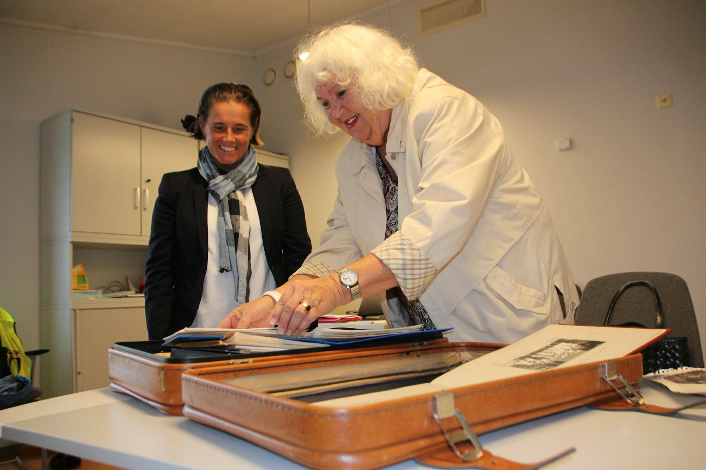 DELER SKOLEMINNER: Tone Buberg (t.h.) ga kofferten med minner fra egen skoletid til rektor Jenny Sundquist og Grorud skole. Foto: Martine MyhreBilde 1 av 1