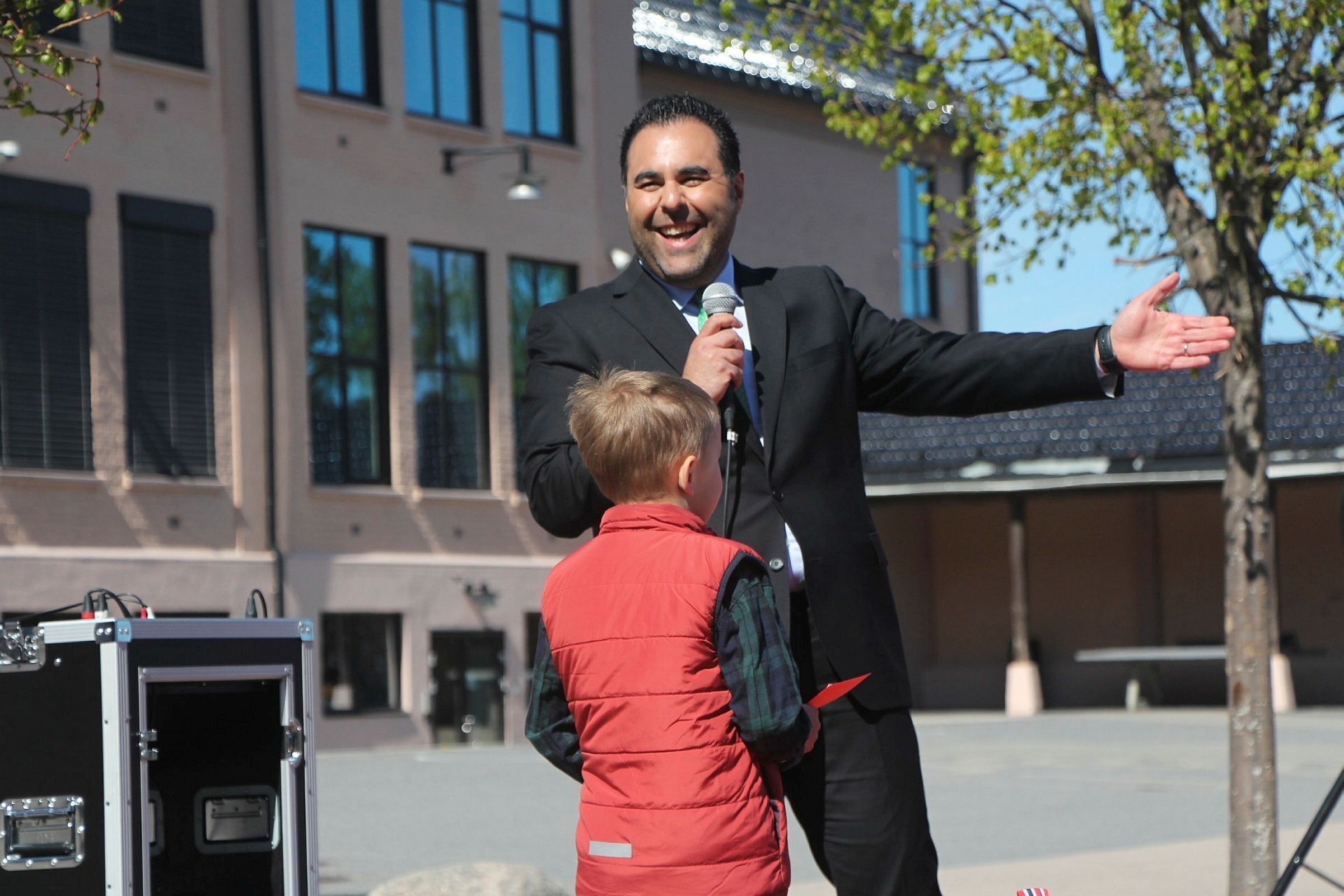 Stortingspresident Masud Gharahkhani (Ap) holdte en kort tale i skolegården før elevene fikk stille spørsmål til Gharahkhani. «Hvordan er det å være politiker i Arbeiderpartiet?» og «Er du troende?» var noen av spørsmålene før stortingspresidenten fikk omvisning på skolens eget museum.