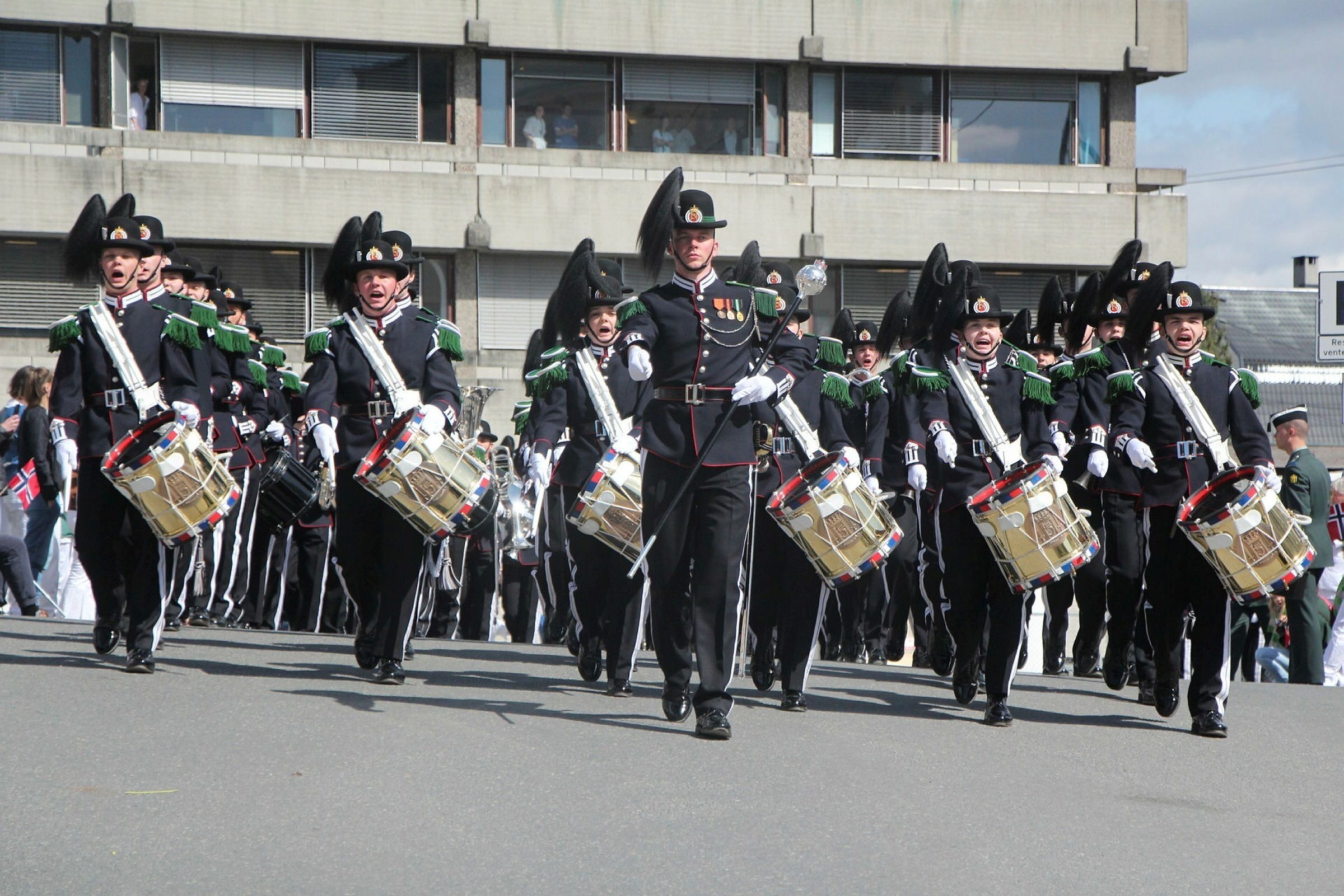 AKER SYKEHUS: Hans Majestet Kongens Gardes 3. kompani var på et tidlig 17. mai-besøk på Aker sykehus tirsdag ettermiddag. Foto: Sindre Veum ApnesethBilde 1 av 3