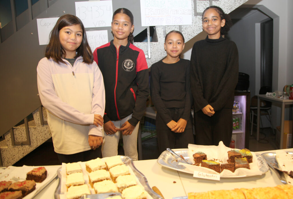 VIKTIG INNSATS: Sara (9, f. v.), Tina (13), Sophia (9) og Hildana (13) jobbet i kafeteriaen. En viktig innsats som gir penger i skolekorpskassa. De tre første er i drilltroppen, mens Hildana er musikant. FOTO: Rolf E. Wulff
