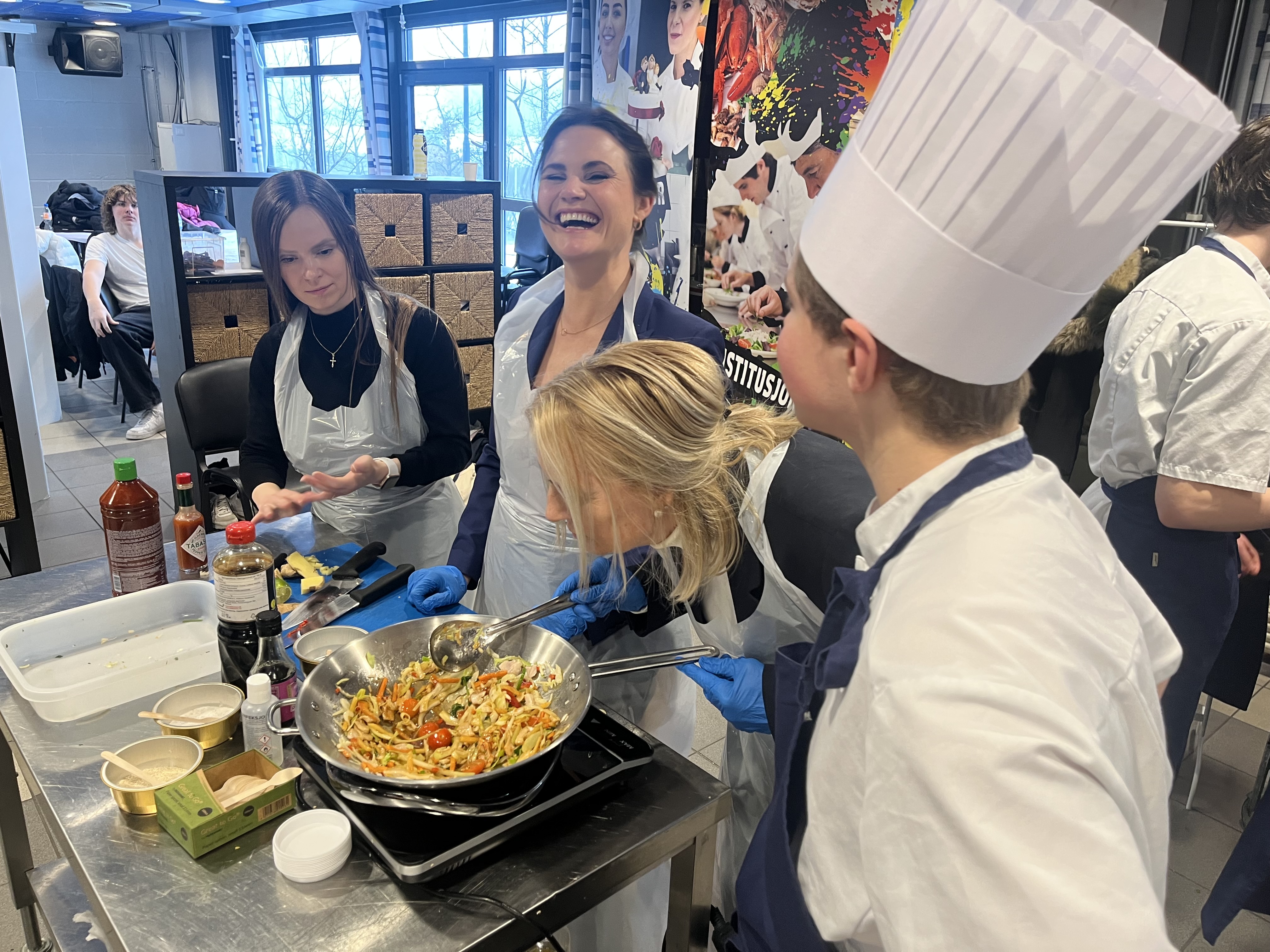 WOKKER: Her lager BU-leder i Alna, Mari Morken (f.v), kunnskapsminister Kari Nessa Nordtun og grunnlegger av Yrkesfagmessen, Tone Haraldsen, wok med instruksjoner fra «kokkene» fra Etterstad videregående.Bilde 1 av 4
