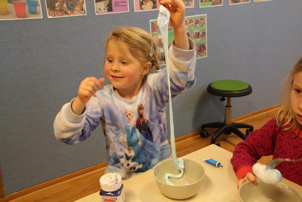 - Nå klarer vi å lage slim helt alene, uten noen hjelp fra de voksne, sier Kristin (5).