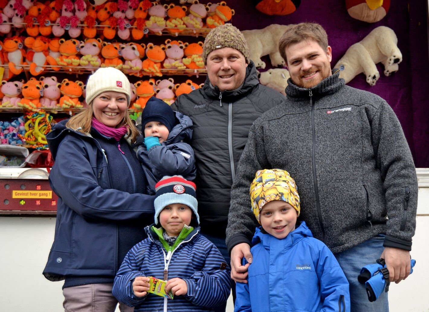 MORO PÅ TIVOLI: Det var som vanlig påsketivoli på Grorud. Lille Leo satt trygt på mammas arm, mens Max og Andreas akkurat hadde tid til å posere for fotografen før de skulle vinne flere bamser. - Når det ikke er noe særlig snø, så er det ålreit å ha et tivoli å dra til, synes pappa Steffen (t.h.). Foto:Bilde 1 av 4