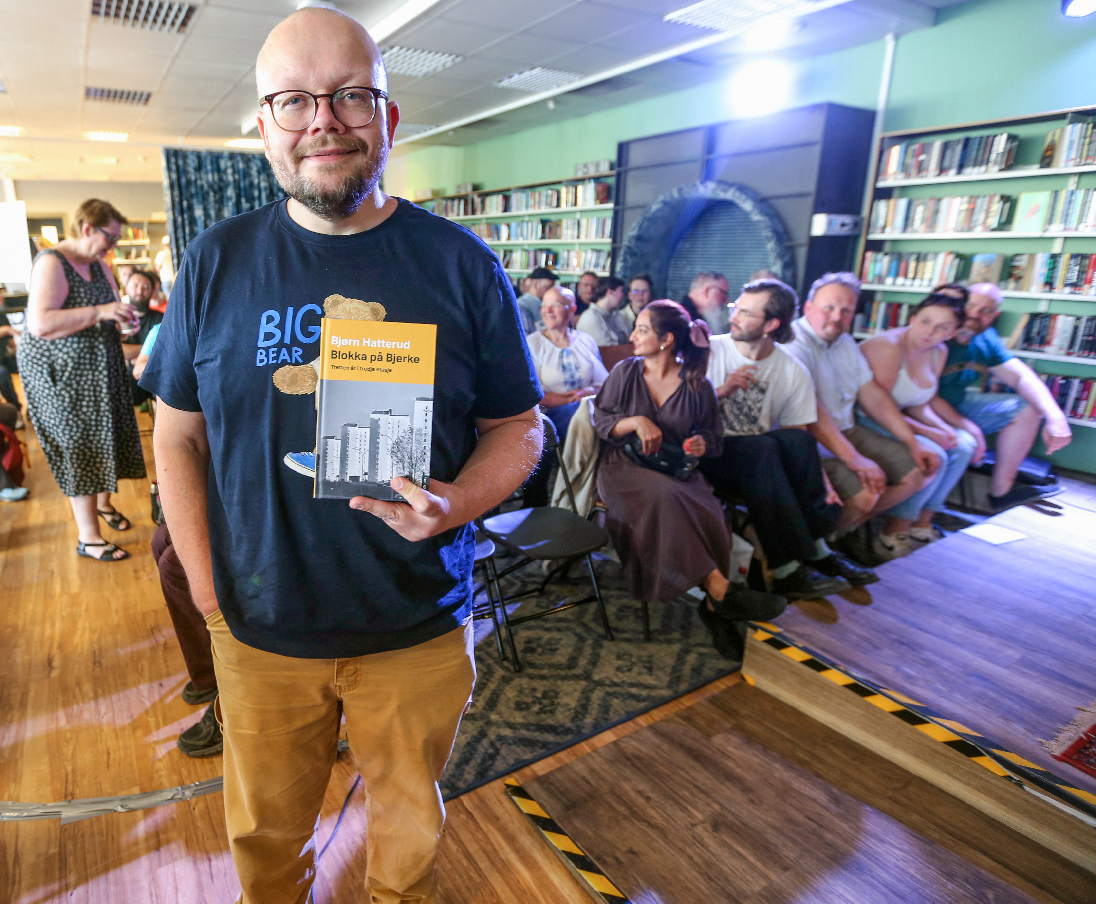 SKRIVENDE BLOKKBEBOER: Bjørn Hatterud bodde 13 år i en av høyblokkene i Refstadsvingen i Bydel Bjerke - slikt blir det bok ut av. Her fra presentasjonen av boka, på Deichman Bjerke. FOTO: Rolf E. WulffBilde 1 av 3