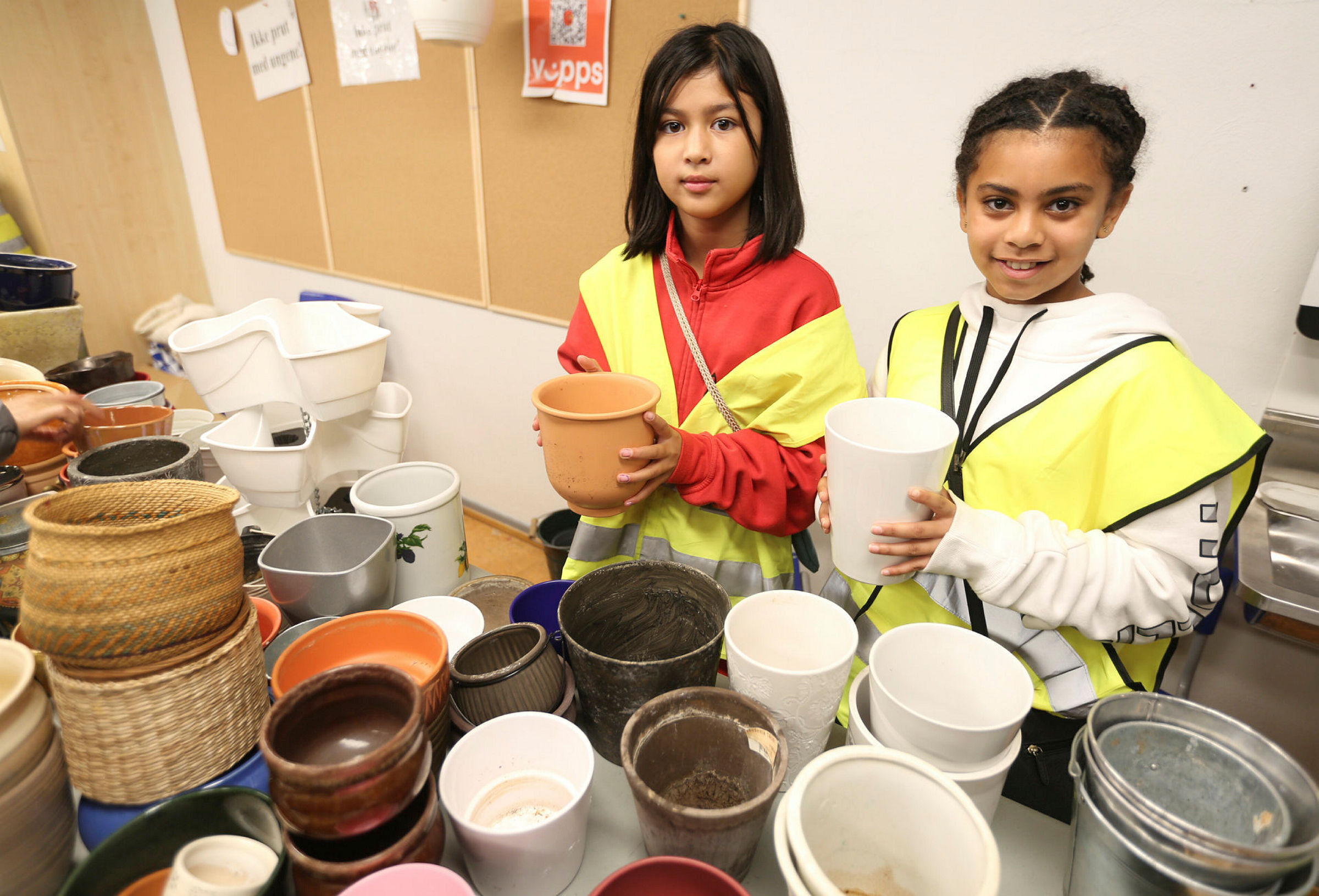 GODT SALG:Michelle (t.v.) og Mader var fornøyd med blomsterpottesalget. Foto: Rolf E. WulffBilde 1 av 1