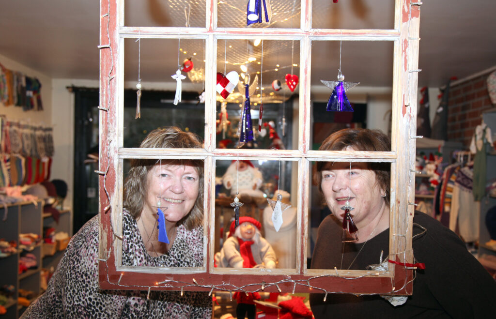 ÅRLIG FORVANDLNG: Sammen med de andre medlemmene av Kulturkjeller’n på Ellingsrud, har Ragnhild Breiby (t. v.) og Lisbeth Nielsen gjort om lokalet til det årlige julehuset, hvor det bugner av hådverk spesielt rettet mot jul og julegavetilbud. FOTO: Rolf E. Wulff