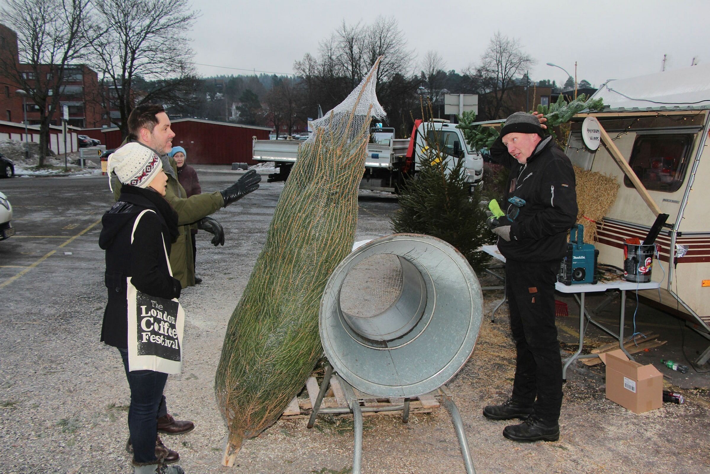 TRADISJON: Hvert år handler Myhrvold-familien juletreet sitt hos Gjermund Sveen (t.h) i Tvetenveien. Det har de gjort i 43 år. Her med Serena Wang, Magnus Myhrvold Eriksen og Eva Myhrvold i bakgrunnen. Foto:Bilde 1 av 4