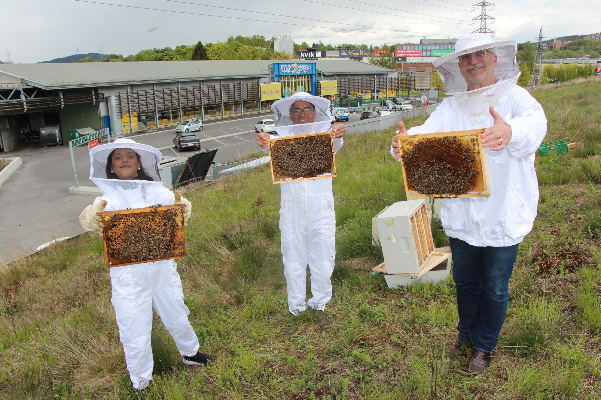 Mandag markerte varaordfører Kamzy Gunaratnam, senterleder på Alna, Hans Georg Helberg, og birøkter Alexander Du Rietz at sesongen er i gang igjen. Siden 2015 har sentret produsert den lokale Alna-honningen som på nytt blir å finne i butikkhyllene når høsten kommer.