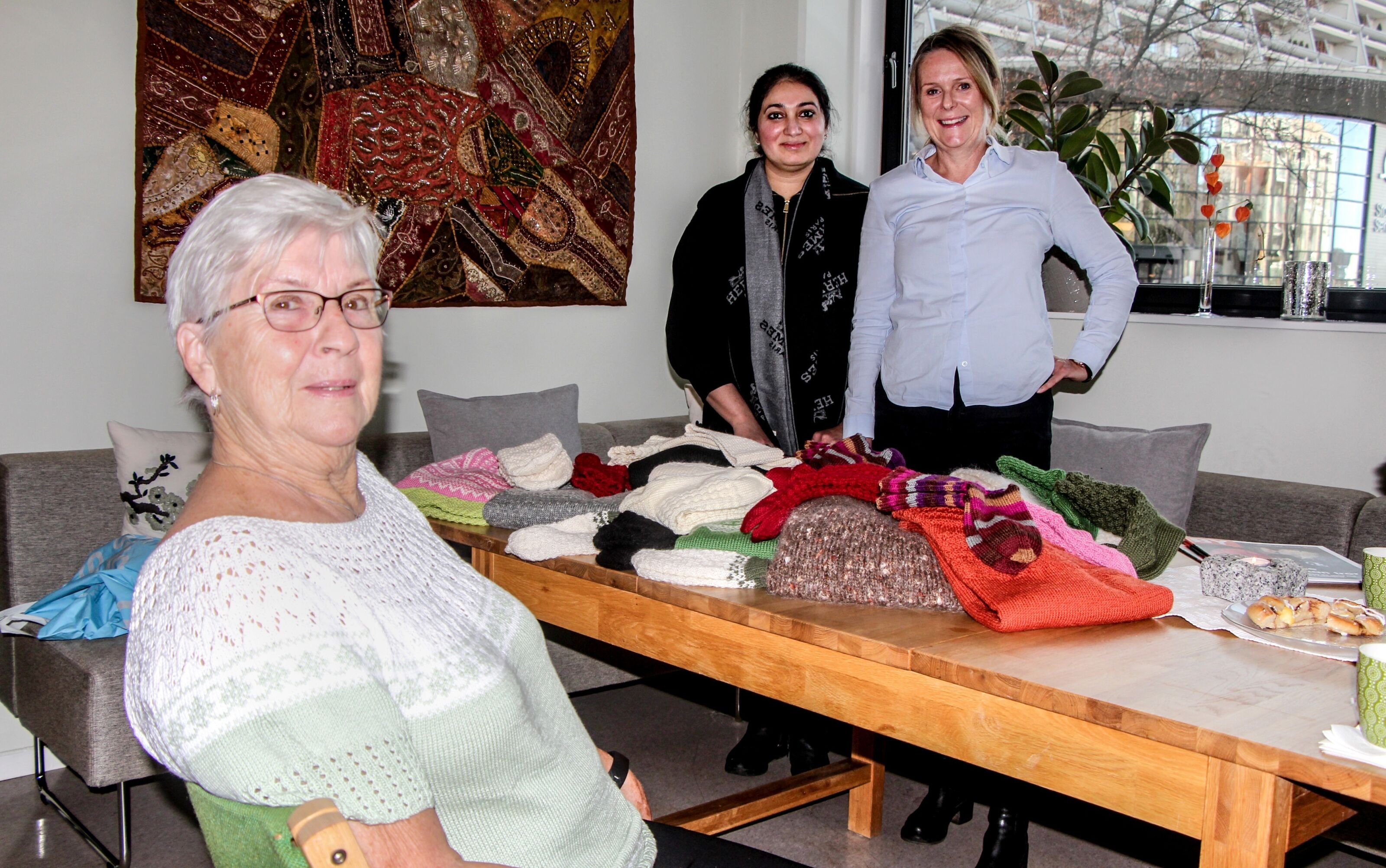 VELLYKKET: Det var kun brede smil å få øye på i Fossum kirke på fredag da Synnøve Johansen overrakte hjemmelagd strikketøy til Kirkens Bymisjon på Stovner. Kirkens Bymisjon bruker strikketøyet i julegaver i arrangementet «Smaken av norsk jul». Her med Sadia Amer (bak, t.v) og Elisabeth Simonsen. Foto:Bilde 1 av 1