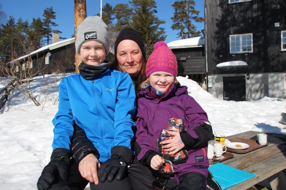SOLRIK PÅSKE: Ivar (8), Ingvild Øgstad og Agnes (5) satte seg ned utenfor Linderudkollen sportsstue for å nye en vaffel i påskesola. Foto: