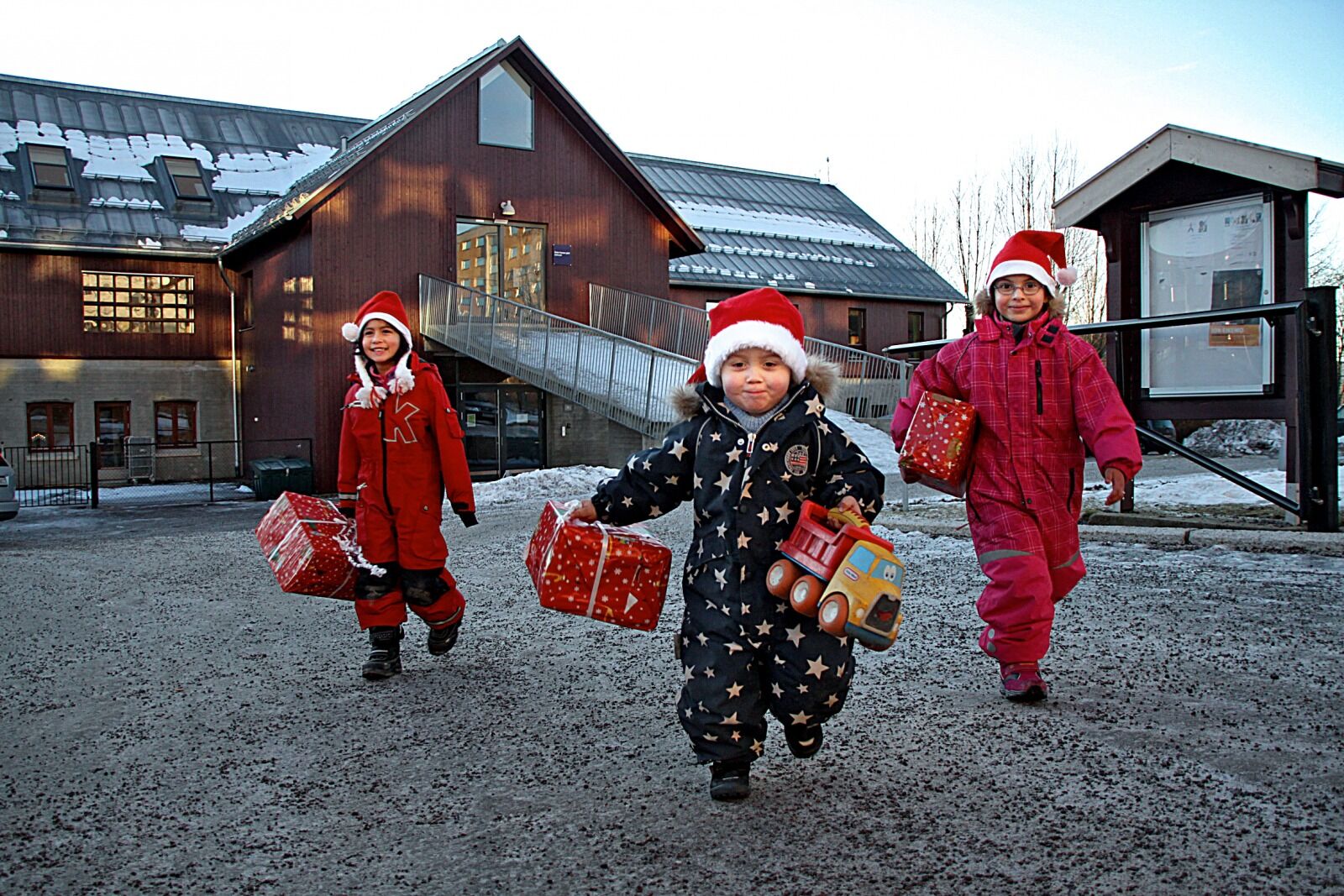 Selv om bakken er glatt, og snøen er fraværende, stopper ikke det Muskan (5), Imane (5), Lang (5) og Nicolai (3) i Nedre Fossum gård barnehage fra å leke ute i vinterværet. De har hatt nissefest med grøt, julenissen og gang rundt juletreet, og har klare meninger om hva julen egentlig er.