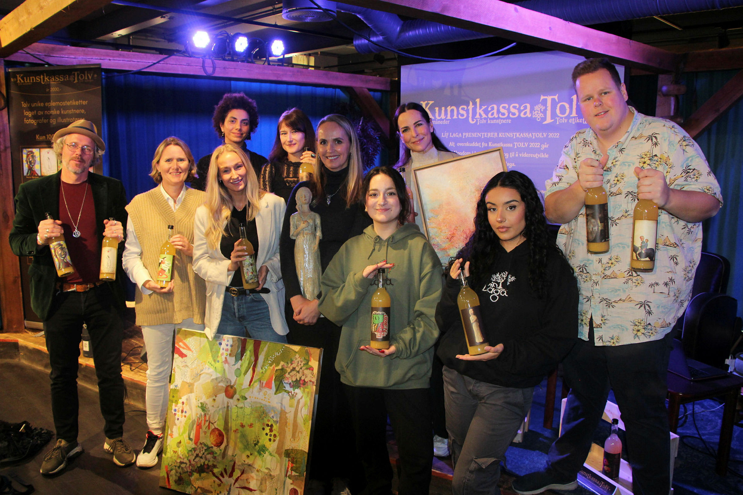 SAMLET: Årets kunstnere, de som hadde anledning til å stille på mandag, sammen med Líf Laga. Nå er «Kunstkassa TOLV» 2022 lansert. Foto: Sindre Veum ApnesethBilde 1 av 1