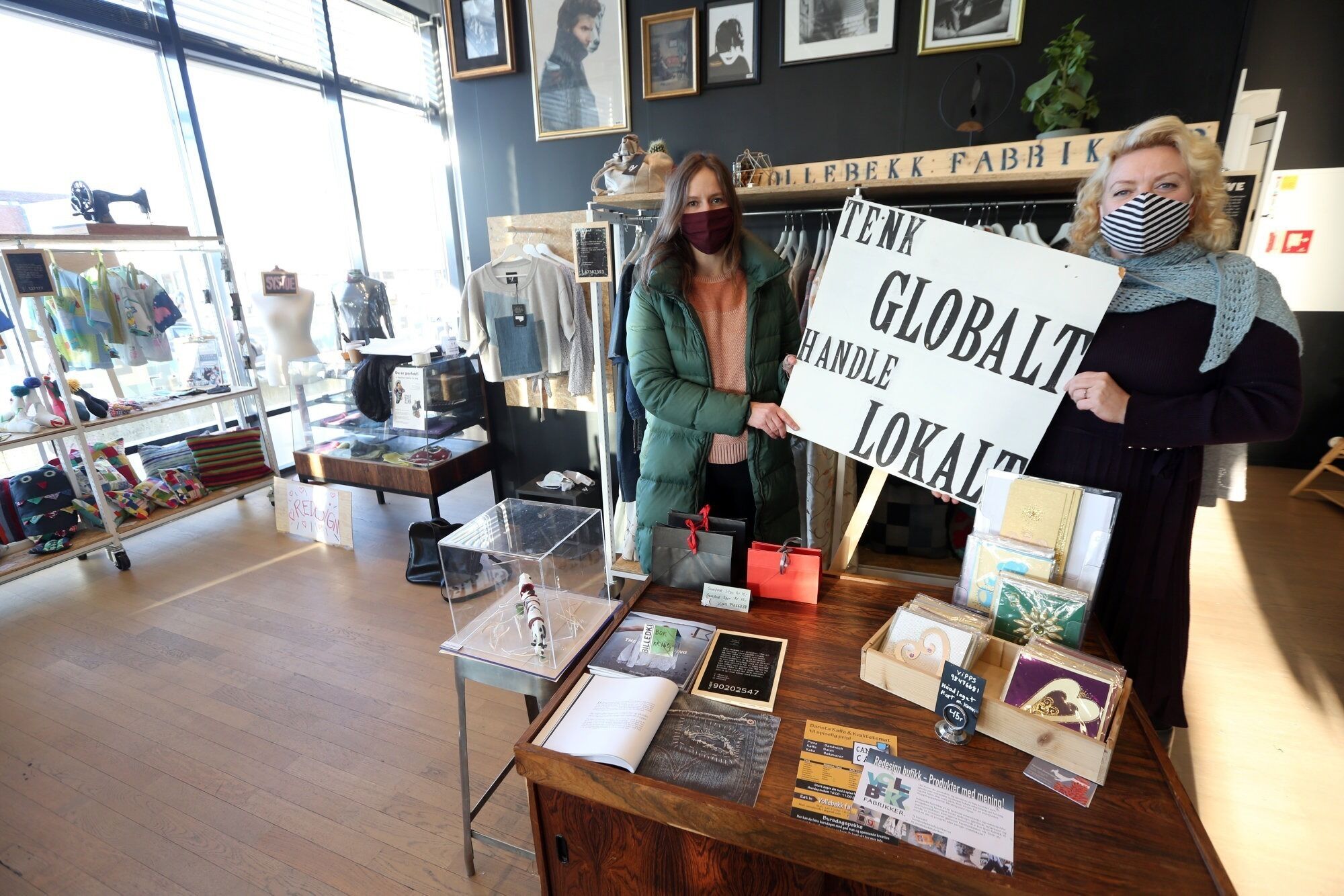 NYTT OG BRUKT: Fabrikksjef Anne Dubrau (t.v.) og community manager og forretningsutvikler Guri Hummelsund ved Vollebekk fabrikker kommer med en synlig oppfordring i den ene kroken i butikklokalet/kafeen. Akkurat her kan du finne nye klær produsert av brukte tekstiler, samt reparasjonskrok for å få fikset opp dine egne gamle klær. Foto:Bilde 1 av 3