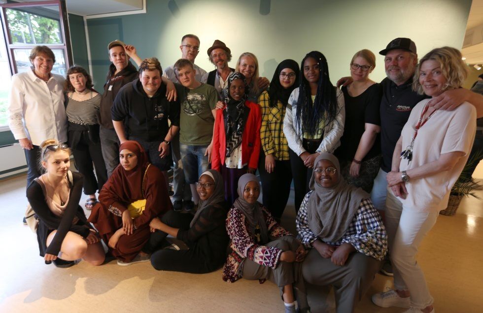 ORDFØRER OG PREST:Mange ungdommer fant veien til åpningen av det nye fritidstibudet. Her sammen med de fire som til daglig skal jobbe ved klubben, Trude Fjell, Jon Martinsen, Maren Frøskeland og Åsmund Gylder. Men blant de jublende på bildet ser vi også sokneprest i Høybråten, Fossum og Stovner menighet, Kåre Rune Hauge og ordfører Marianne Borgen, som ganske enkelt «stakk innom». Dette ville de ha med seg! Foto:Bilde 1 av 3