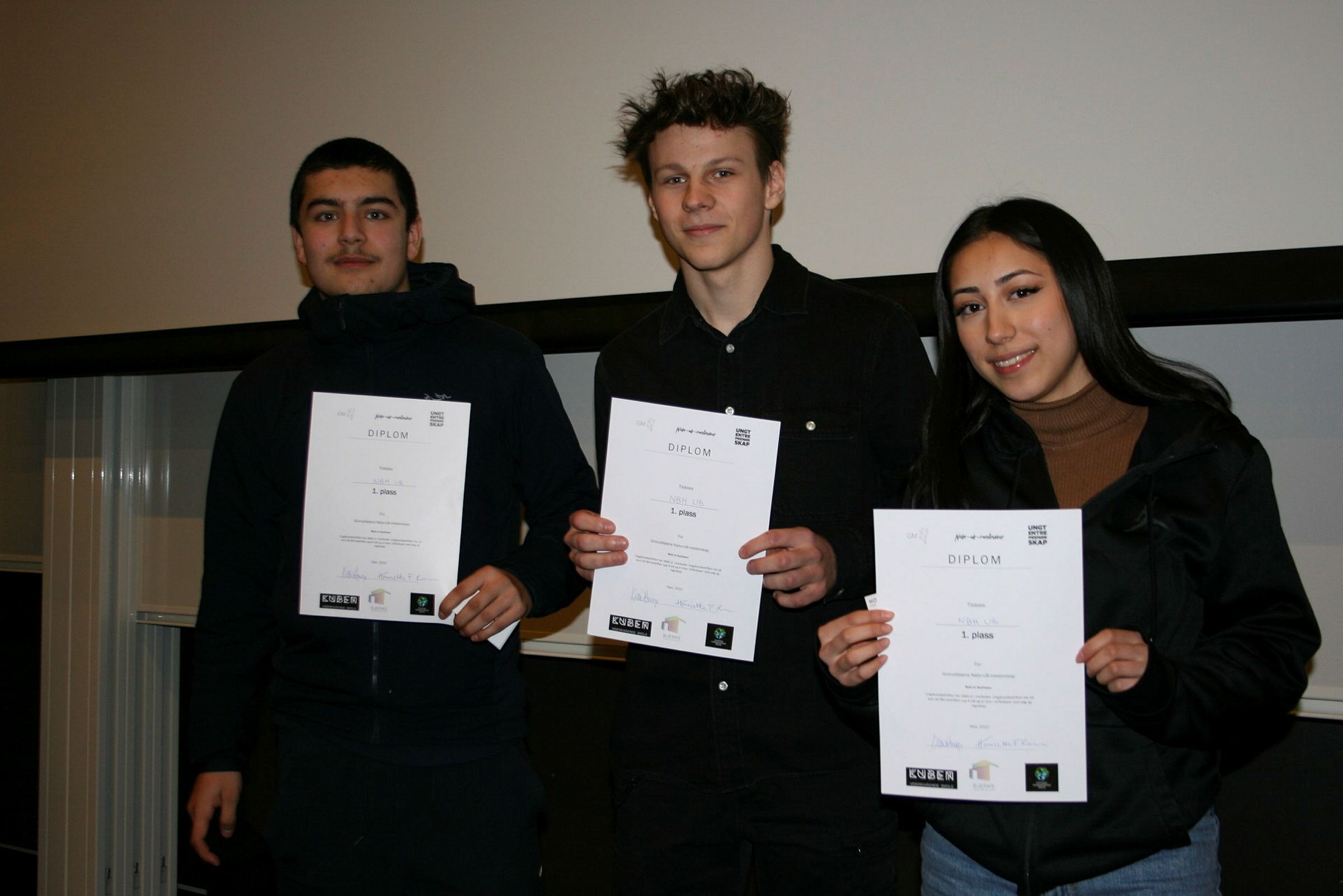 1. PLASS: Benjamin (f.v.), Kacper og Abida i NBH gikk helt til topps i «Best in business»-kategorien. Juryen roste bedriften for det gode fokuset på gjenbruk og for å ha med økonomien i sin presentasjon. Foto: Caroline HammerBilde 1 av 4