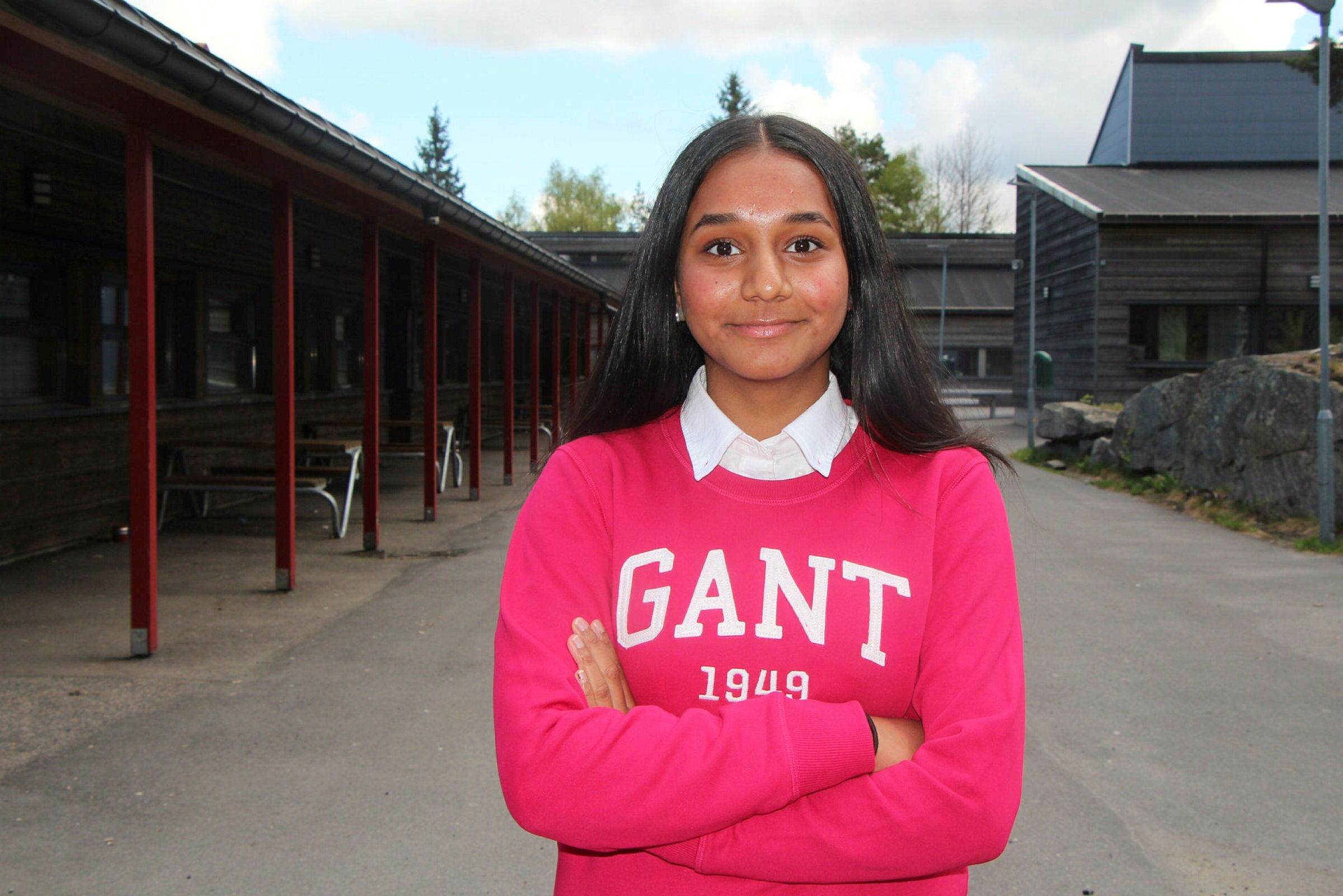 STASJONSFJELLET SKOLE: Diktet til Shayanthavi Thipakaran (14) om hvordan det er å være ungdom under pandemien ble fremført foran kongefamilien og på direktesendt tv i forbindelse med 17. mai-arrangementet på Slottsplassen. Foto: Sindre Veum ApnesethBilde 1 av 1