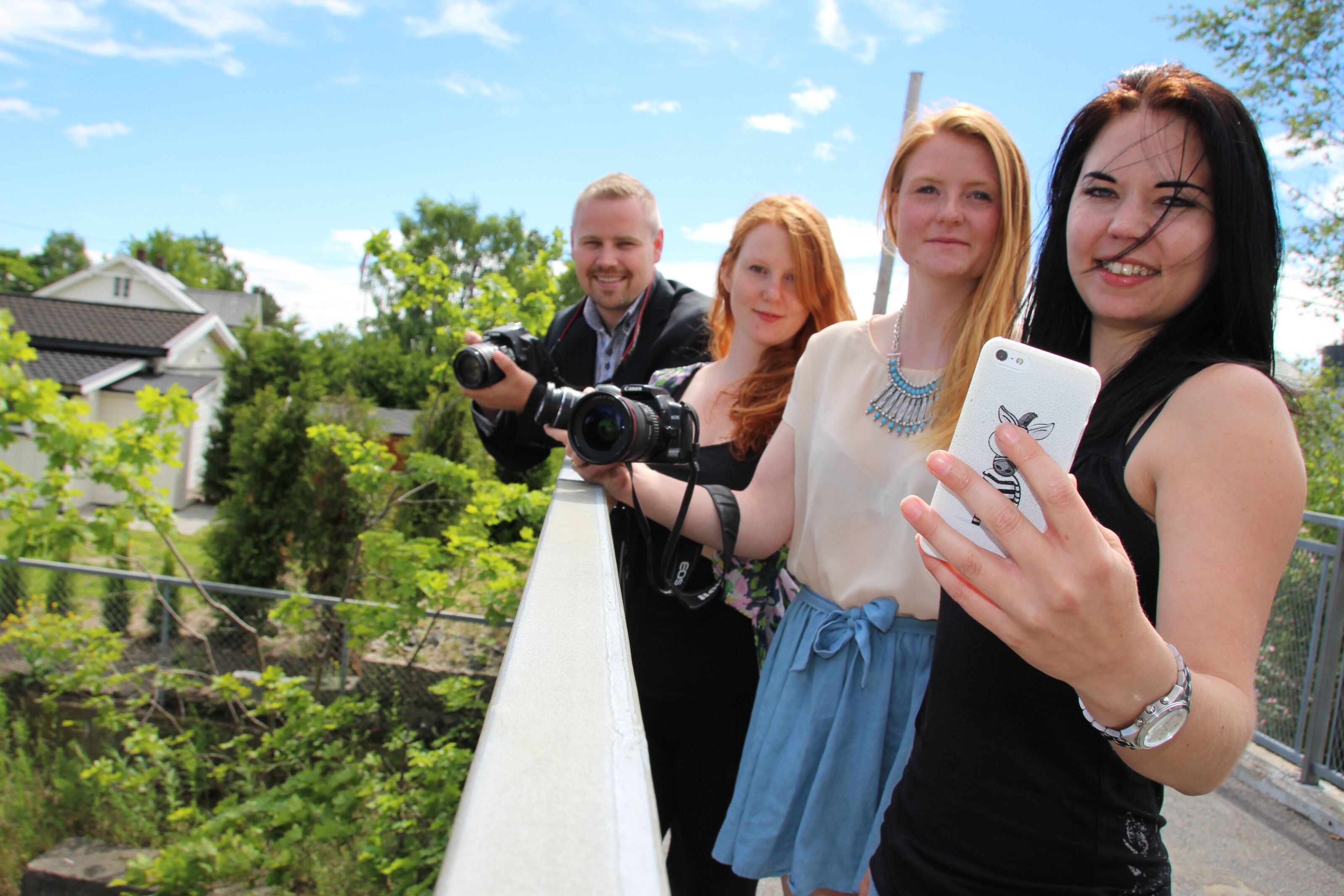 KNIPS I VEI: «Sommerbildet 2014»-konkurransen er i gang og fotojuryen oppfordrer til å sende inn bilder. Her står banksjef Thorbjørn Einseth i Nordea Kalbakken (f.v.), fotograf Tone Tvedt på Grorud Fotosenter og journalistene Caroline Bremer og Elisabeth Tobiassen Faane i Akers Avis Groruddalen. Foto:Bilde 1 av 3