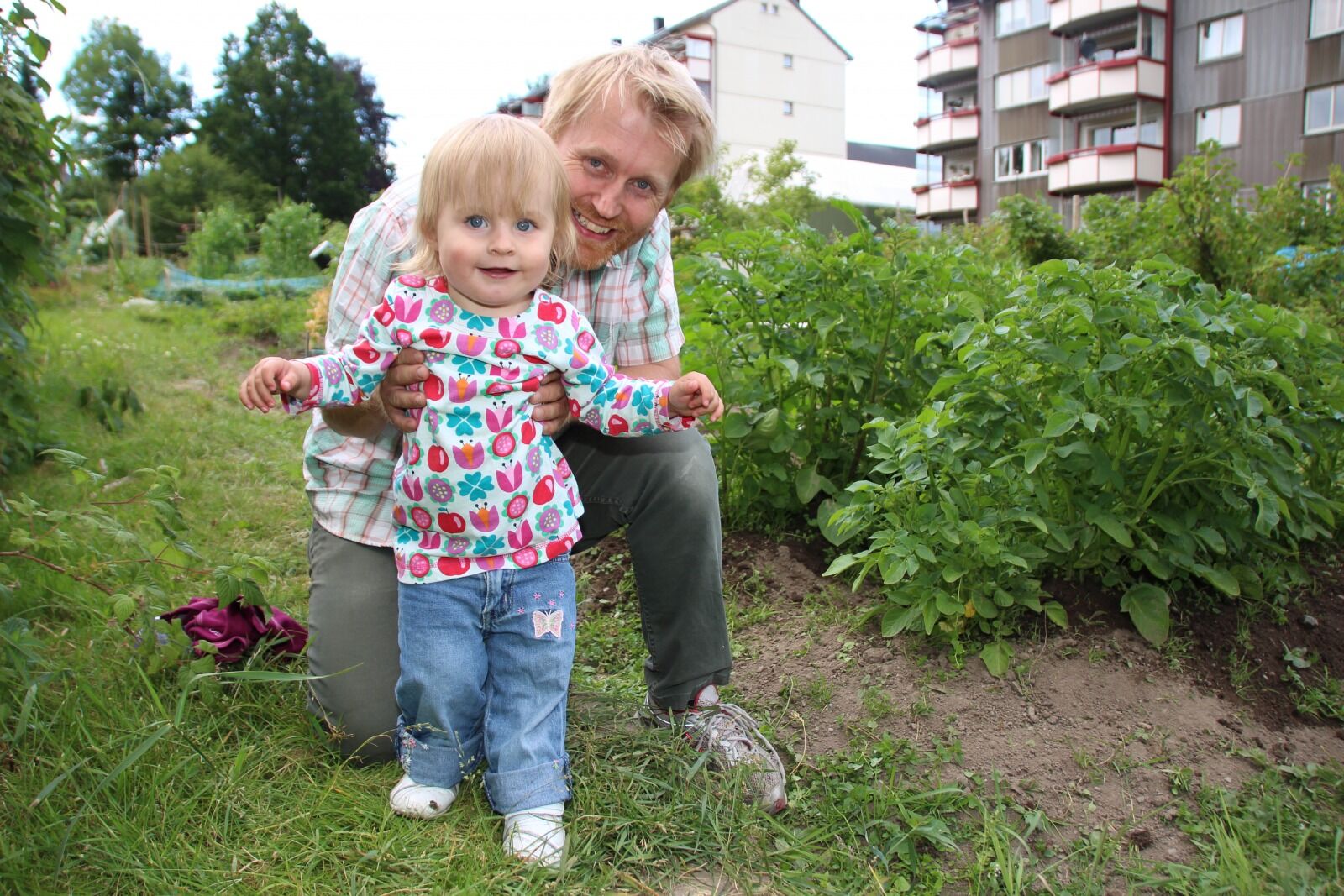 Ole Våge drar med datteren Andrea (1) fra Carl Berner til Årvoll gård for å drive med parsellhage. Nå somdet er sommer er de der nesten annenhver dag.