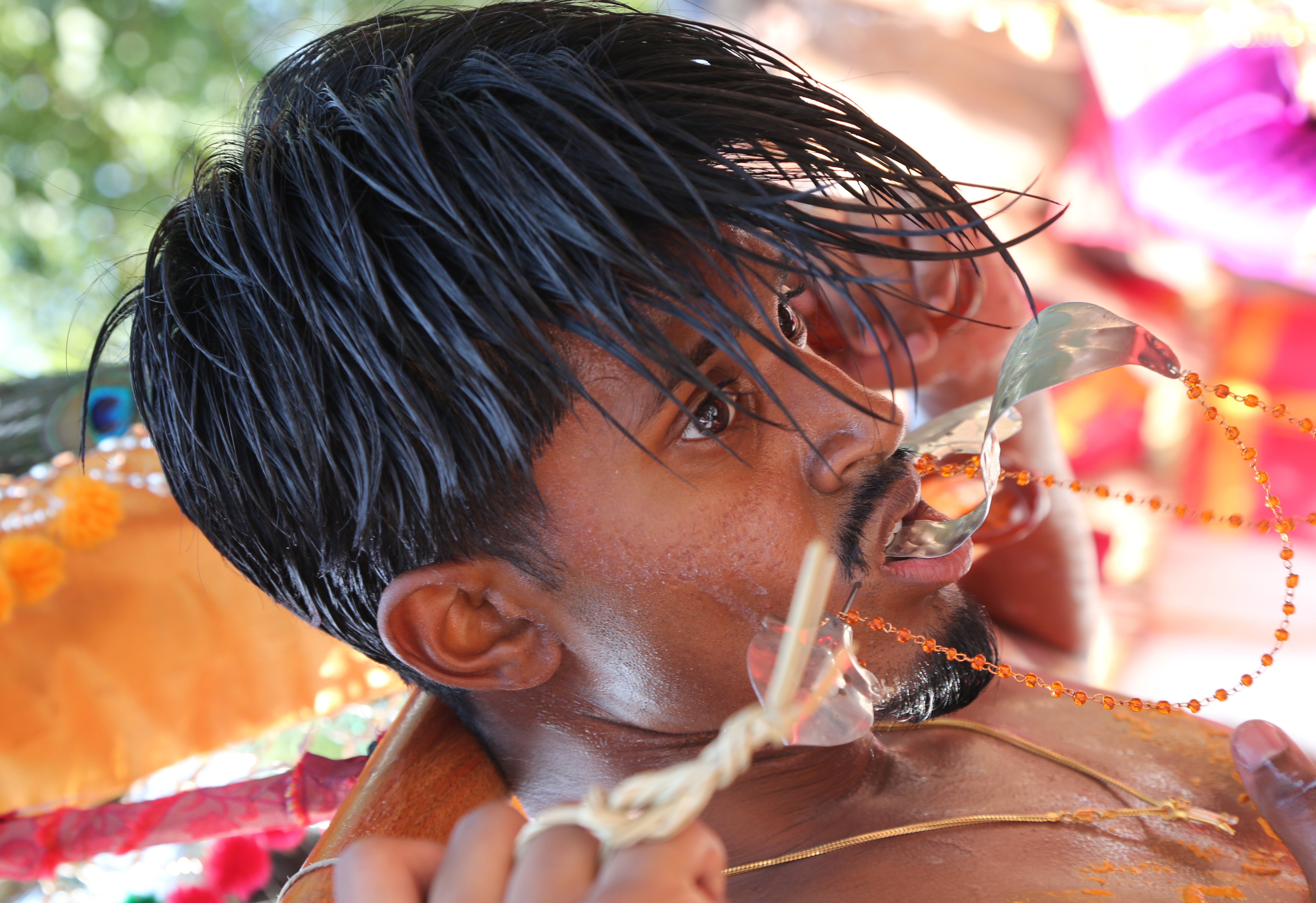 Det er troende som drar i tauene som er festet til de store vognene. Men samtidig er det flere som tar del i en rituell dans hvor det både festes kroker i ryggene og spyd penetreres gjennm kinn og munn. I år fikk lokalavisen også oppleve en kvinne som rullet rundt på bakken gjennom hele den fargerike prosesjonen. Dette er som en takk til gudene for at de har fått et ønske oppfylt.