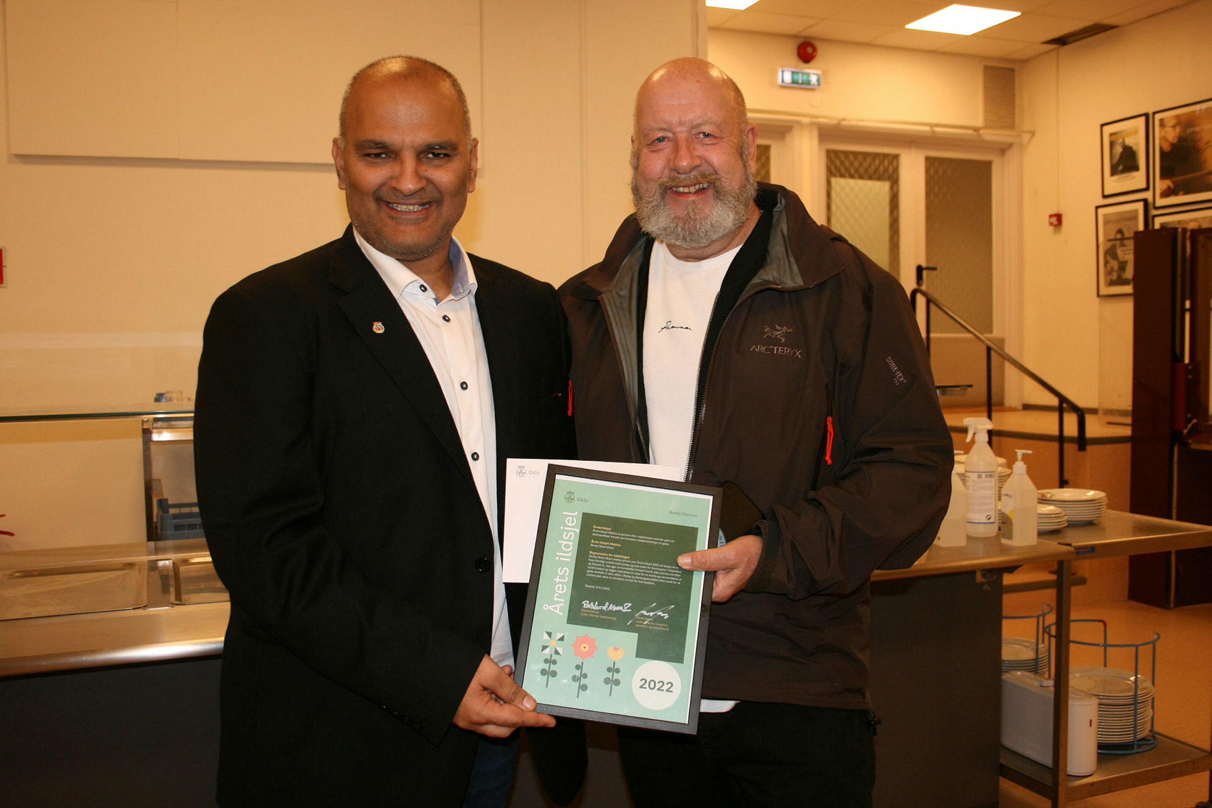 ÅRETS ILDSJEL: Rashid Nawaz (Ap, t.v.) gratulerer Ronny Steen-Olsen med kåringen som Årets Ildsjel, etter et helt liv som frivillig ildsjel. Foto: Caroline HammerBilde 1 av 1