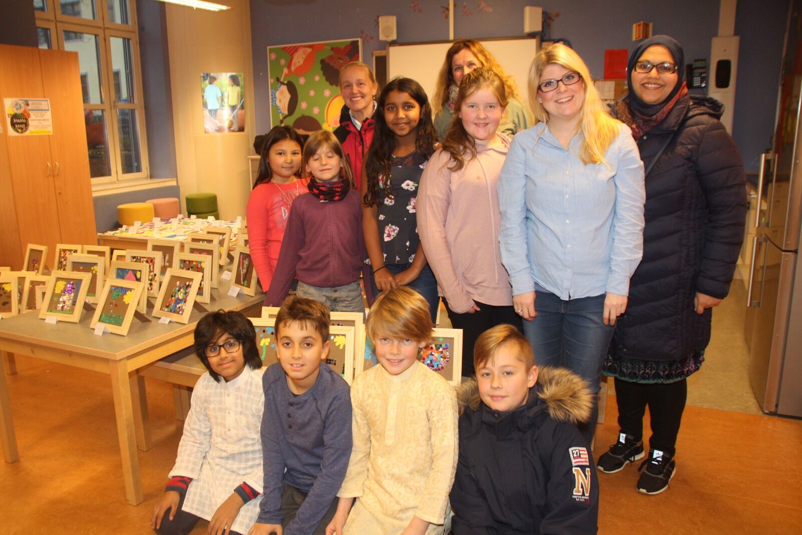 I FELLESSKAP: Rektor Eva Sørby(bak f.v.), SMU-leder Hanne Hovdedalen, AKS-leder Caroline Asdal, FAU-leder Attia Mirza Mehmood, Viola (8), Shadia (9), Nelly (11), Timur (8), Torstein (9) og Mathias (12) har alle stått på og samarbeidet om FN-feiringen på Bryn skole. Foto:Bilde 1 av 1