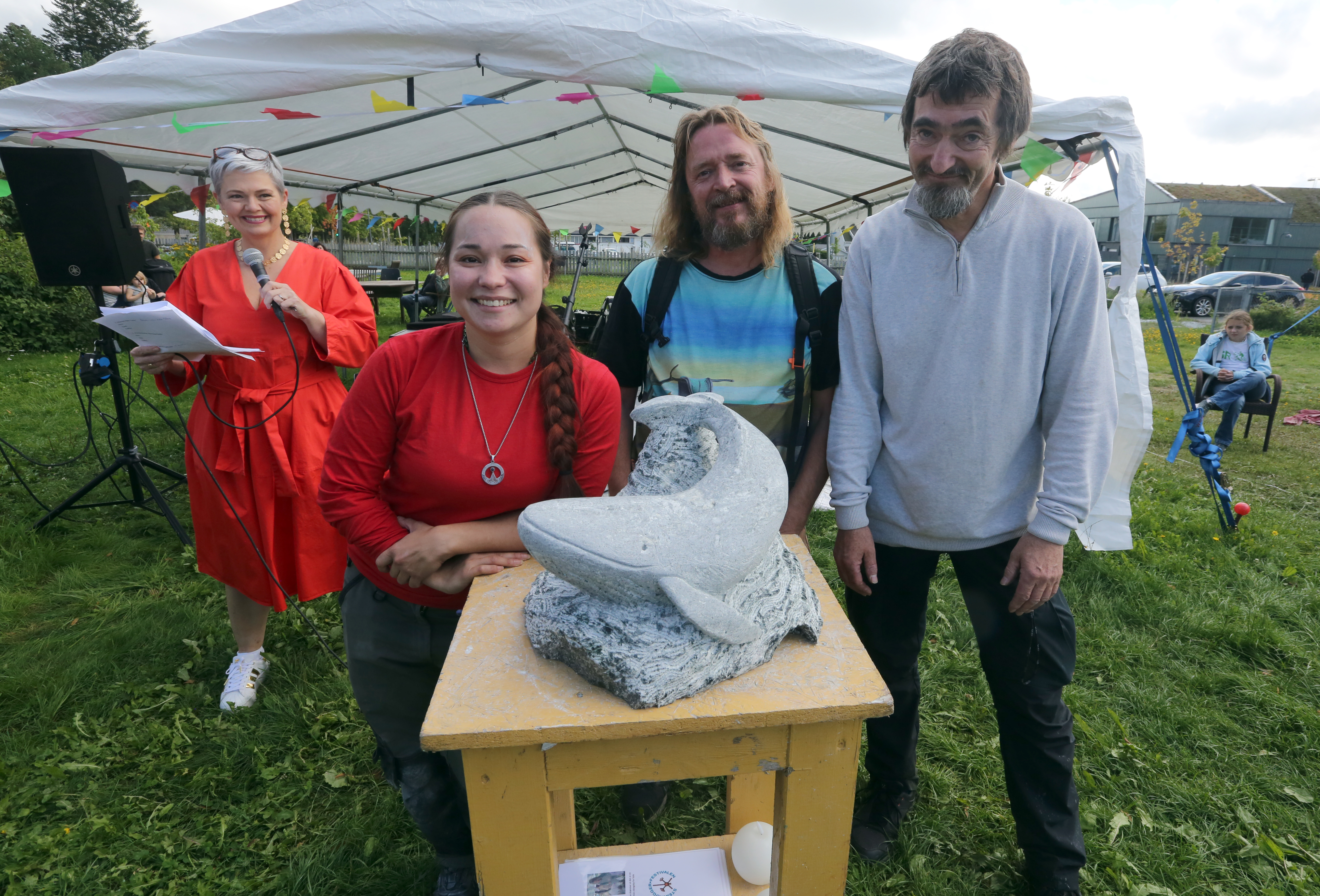 Etter godt besøk på lørdag ble det enda flere som fant veien til Steinhoggerhagen på søndag. Da kunne publikum med egne øyne se den siste finpussen på de forskjellige steinskulpturene. Samtlige flotte kunstverk, og med tanke på hvor liten tid de har hatt på seg til å hogge frem en skulptur, blir det enda mer imponerende. Vi skjønte tidlig at det var nettopp «Scotty» sin hval som ville bli den store «snakkisen». Det var også de andre steinhoggerne skjønt enige i.