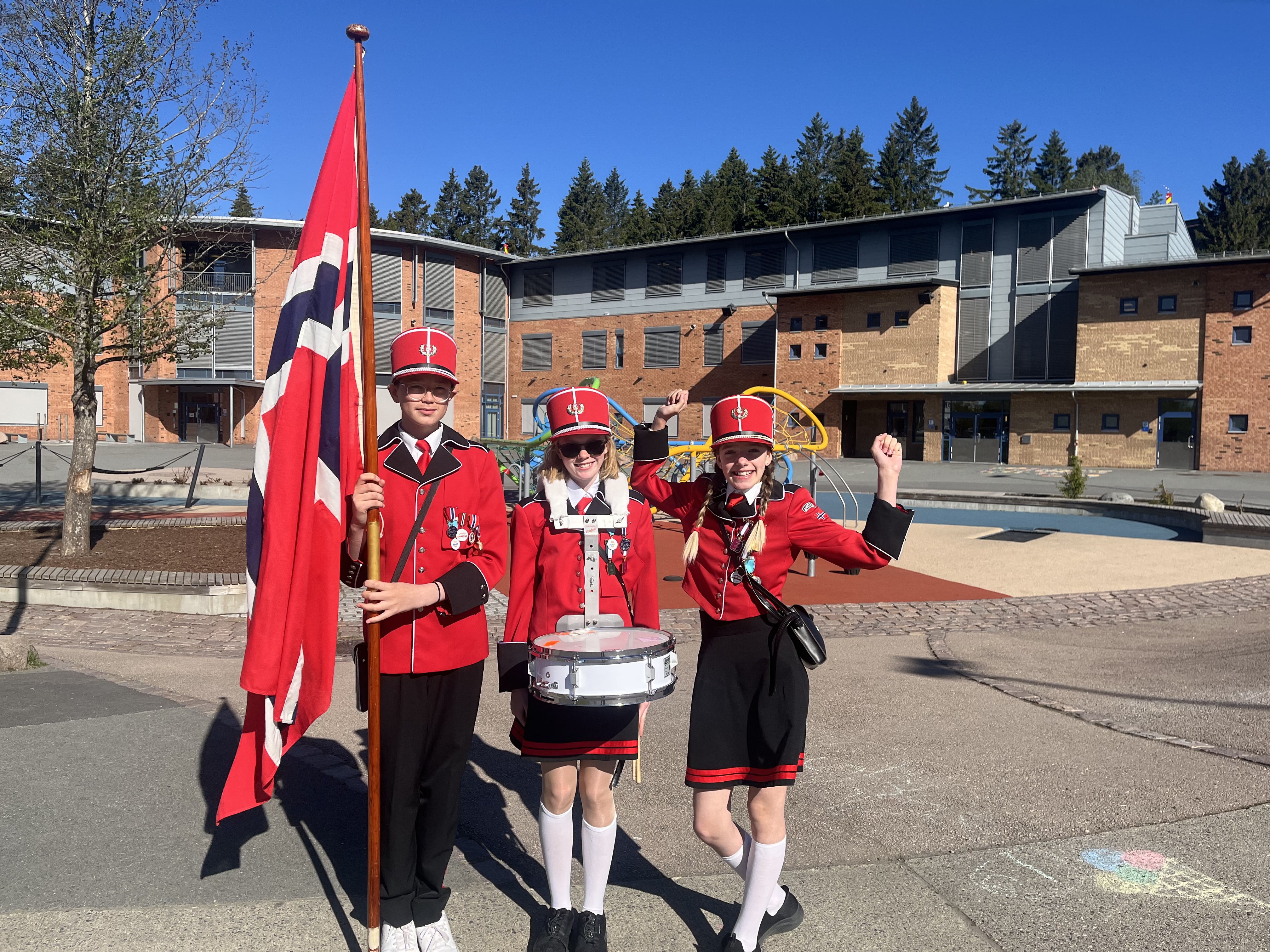 GLEDE OG SOLSKINN: Moritz Erik Salvesen Michael (f.v.), Hedda Arnkvern Brosten og Emilie Victoria Kløw spiller alle i Ammerud skoles musikkorps og ser fram til den store dagen. Her poserer de med skolen i bakgrunnen, under strålende sol og skyfri himmel, like før festen starter.Bilde 1 av 1