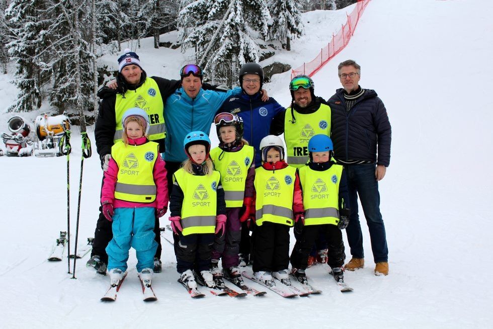 SKISKOLE: Lederen for skisenteret, Ole Edvard Stovner Weisæth (t.h), sammen med trenerne og skiskole-elevene. Foto:Bilde 1 av 6 For å se disse bildene må du ha et abonnement