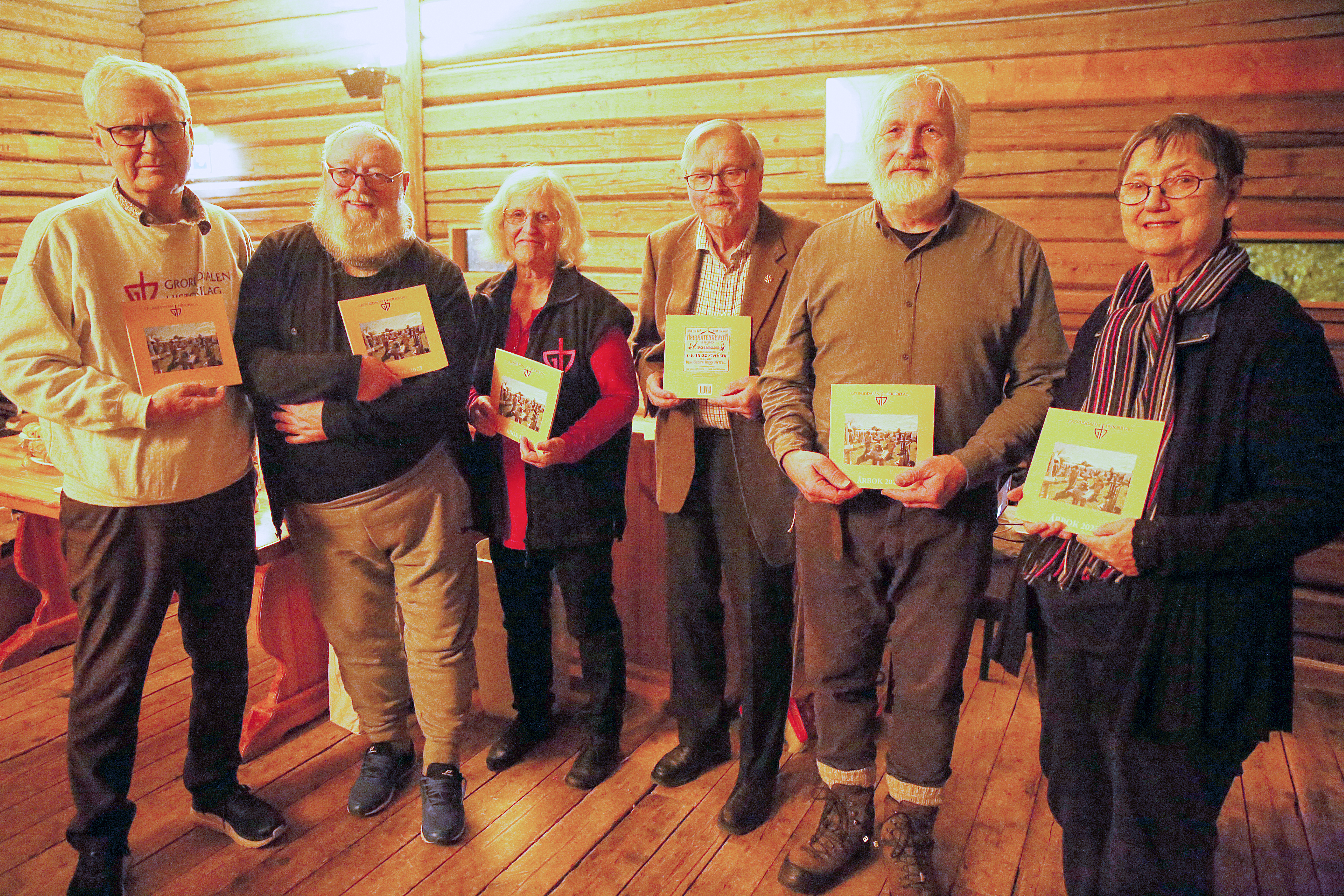 SKRIVEGLAD GJENG: De tilstedeværende skribenter i årets utgave av historieboka, fikk som vanlig utlevert en signert utgave. Jan Arne Tangerud (f v), Per Willy Nordrum, Anne Fikkan, Rolf E. Torbo, Håvard Pedersen og Gro Strømme. FOTO: Rolf E. WulffBilde 1 av 3