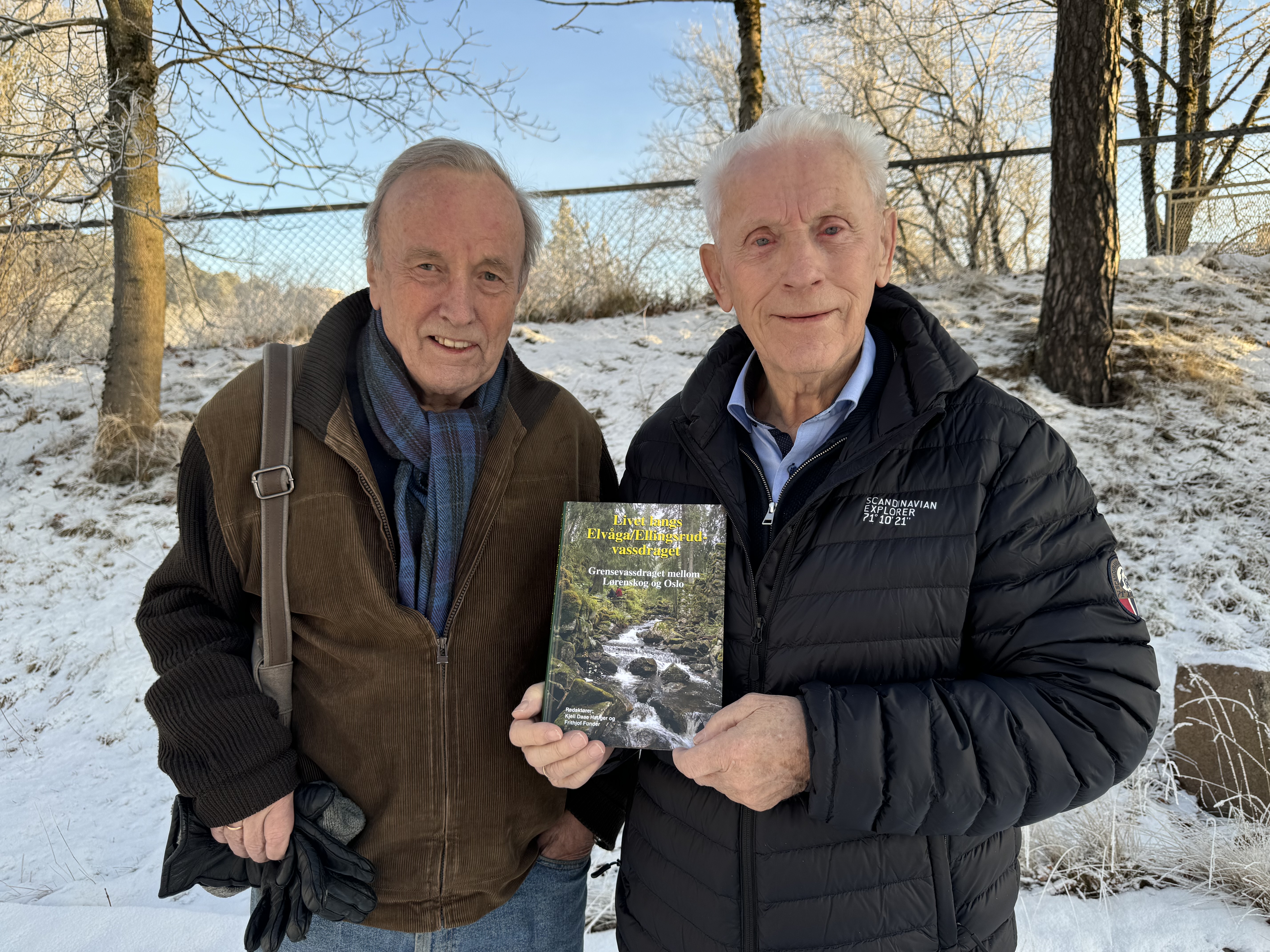NY BOK: Frithjof Funder (t.v.) og Kjell Daae Hauger har samlet mye interessant historie om Ellingsrud i én bok. Her med boka i avishagen.